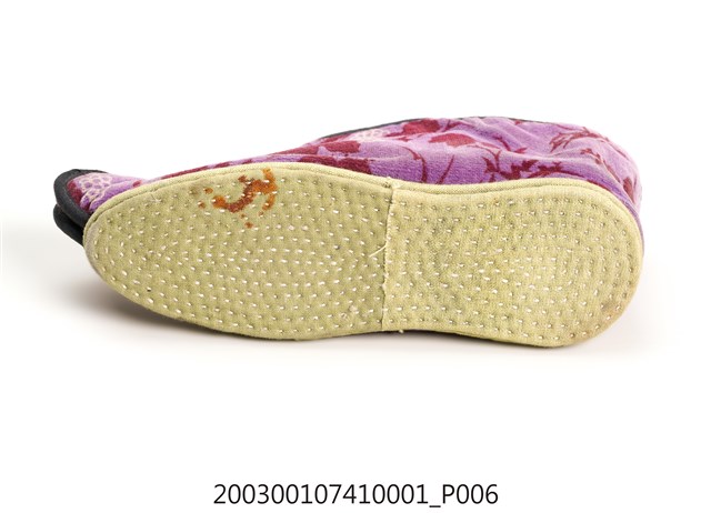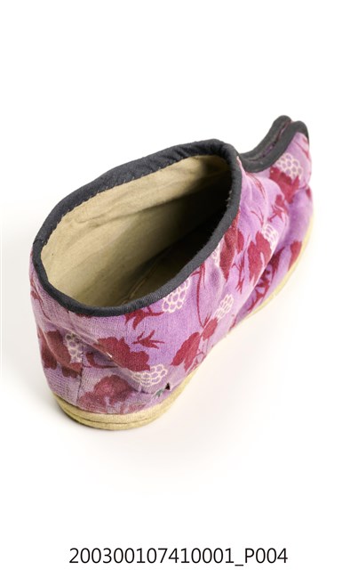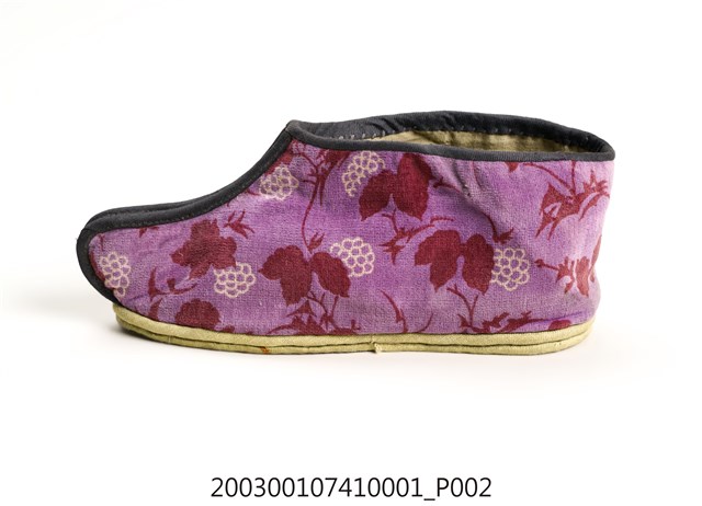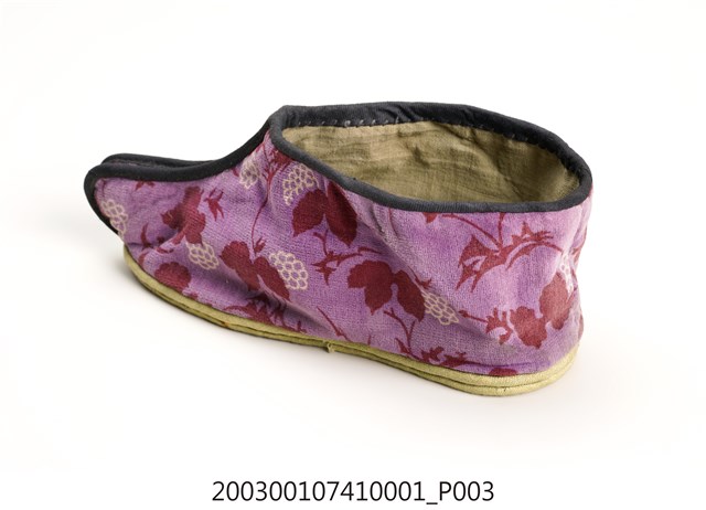 2003.001.0741.0001 粉紫色葡萄花葉印紋女布鞋左足