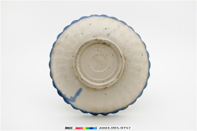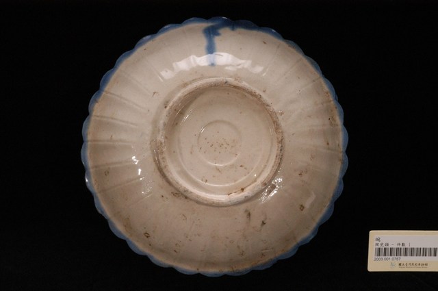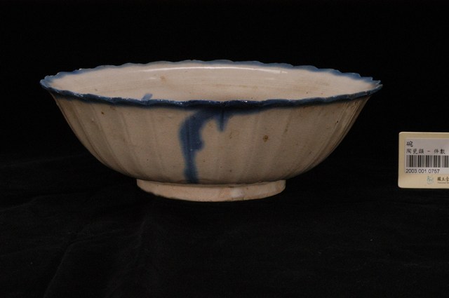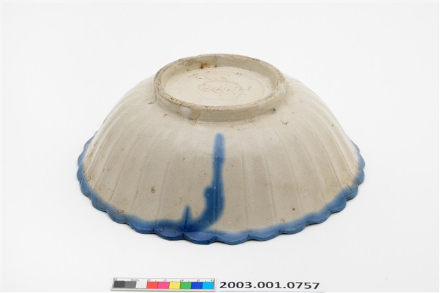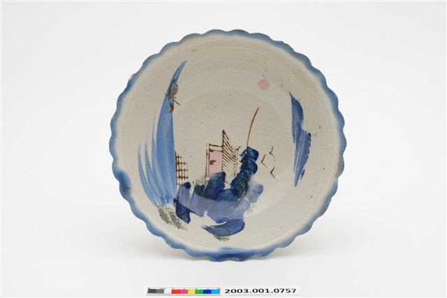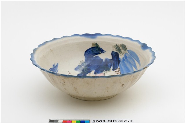 戰後初期家庭常見之餐飲用器。敞口、弧壁、碗底較淺而寬,帶圈足花口大碗,以模具成形,並於白色長石釉上裝飾彩釉之後,高溫燒成。形制上,口緣做成菱瓣形,共三十瓣花口,碗壁亦模印一道一道的花瓣稜脊,整體造型猶如盛開花朵。裸足露灰白胎,足內沾黏少量窯沙,除圈足之外全器滿釉。口緣施罩一圈青色釉彩,碗外壁素面無紋,口緣青色釉彩滴釉流動,另類的天然裝飾。碗心並用彩繪與印花兩種技法,以青、藍、綠、粉紅、褐彩顏料描寫孤舟、老藤、野屋、飛鳥、遠山風景,一輪明月高掛天空。孤舟、竹籬、房舍與綠樹採用印花裝飾技法,遠山、近水與樹石則以純熟筆法寫就。1960年代北部地區鶯歌等窯製品。本件作品與典藏品2003.001.0162、2003.001.0163、2003.001.0756彩繪山水紋花口瓷碗風格幾乎一致,很可能是同一批號生產。這也符合家庭餐具經常是成套採買的消費模式。