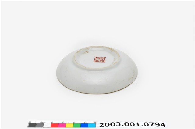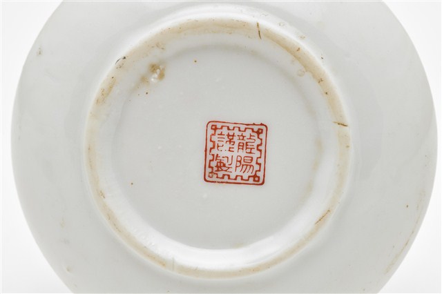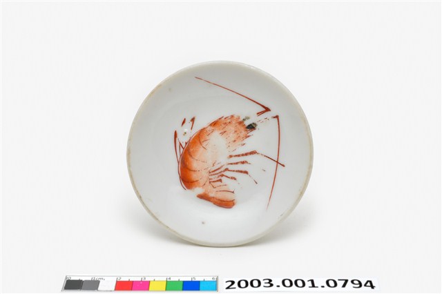 小碟以壓模製成胎體,敞口圓唇,淺弧腹,圈足,胎色白,內外施均勻白釉,釉色乳白,盤底有製造商方形朱印「龍陽謹製」,為臺灣早期大量生產的食器。盤心蝦紋以印模圖案蓋印上色釉,並手繪加彩點出蝦眼、塗繪蝦身,表現出蝦頭尖刺硬殼、肥碩蝦身環節彎曲,以及短直伸展的長鬚。「蝦紋」常見於臺灣早期盤碟裝飾,餐桌上有魚有蝦,象徵富裕,此外,蝦的腰呈鎧形,而又能自由彎曲,並有很大的跳動力,所以寓意時來運轉與順利。這類描繪身體彎曲,蝦足前張,長鬚向後仰的蝦圖又叫「彎彎順」,是盤碟上蝦紋的標準模式。