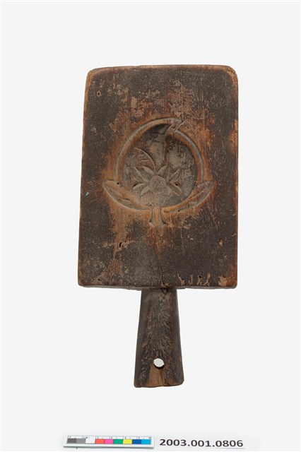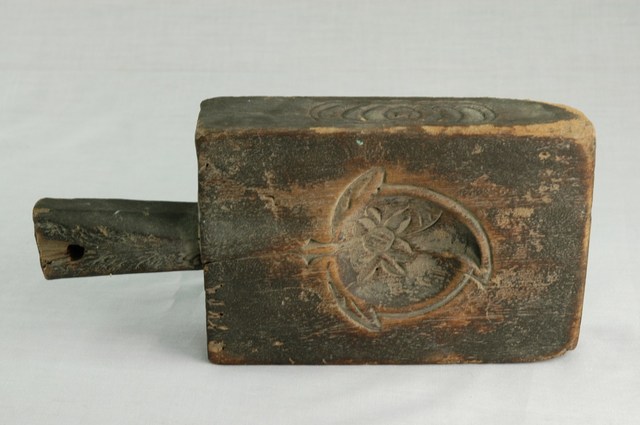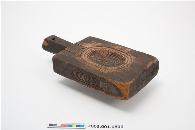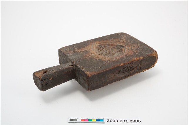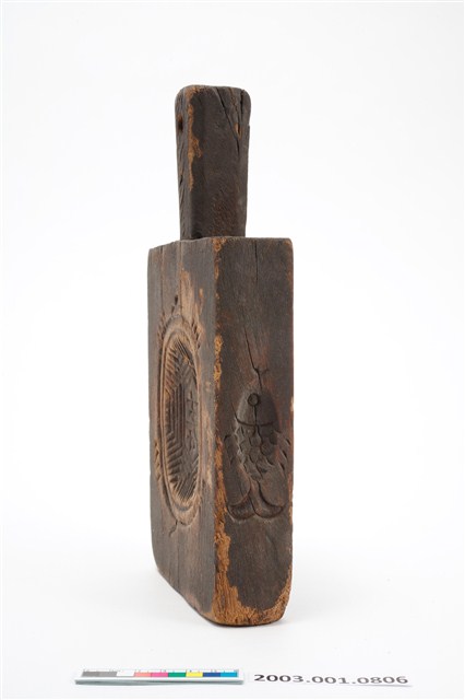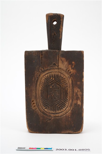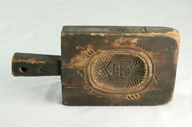 2003.001.0806 長方形四面雕龜桃連錢魚紋帶柄粿印