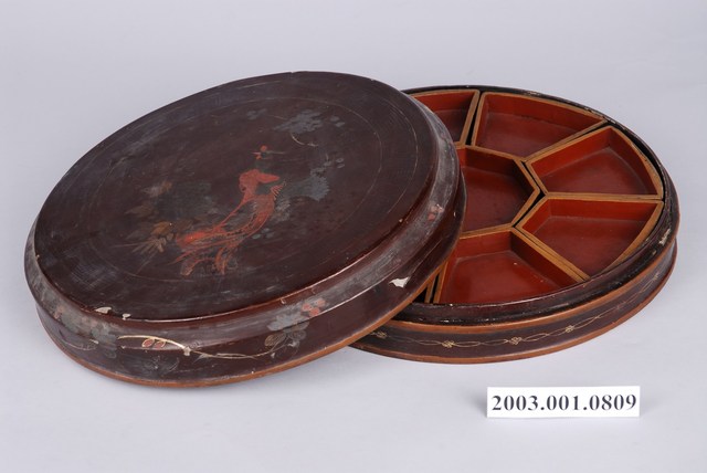 褐漆鳳凰紋糖果盤組,包含上蓋、底盤和九個分隔盤,共十一件。木胎,表面髹褐漆。上蓋和底盤皆為圓形,蓋頂中央刻繪鳳凰和牡丹圖樣,以回紋圍繞。底盤盒身側邊飾以花卉幾何紋,內放九個分隔盤,中央分隔盤為八角形,四周環繞著八個扇形分隔盤。