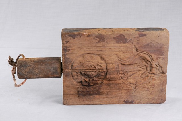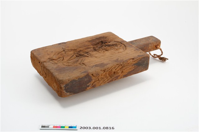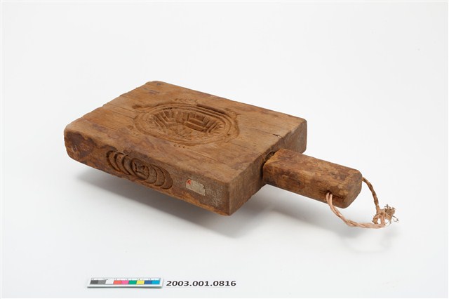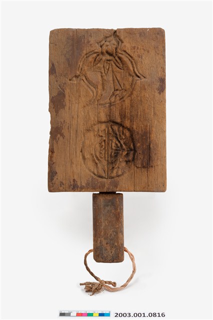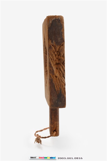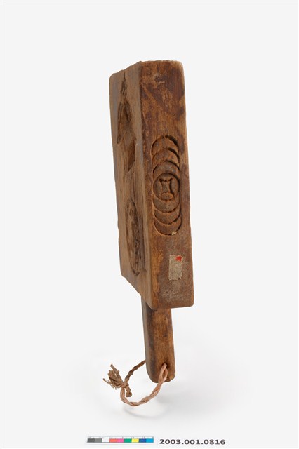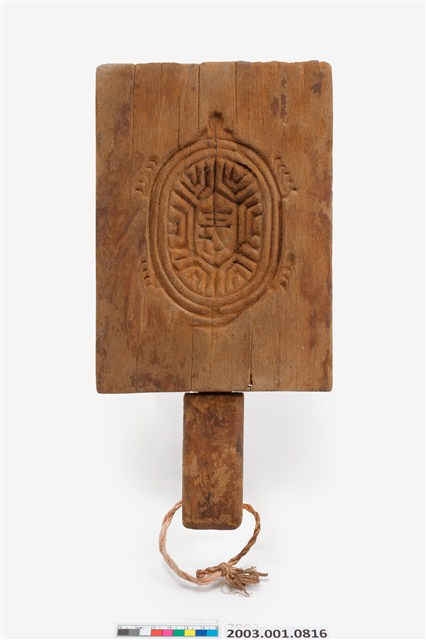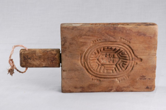 2003.001.0816 長方形四面雕龜桃銀圓連錢魚紋帶柄粿印