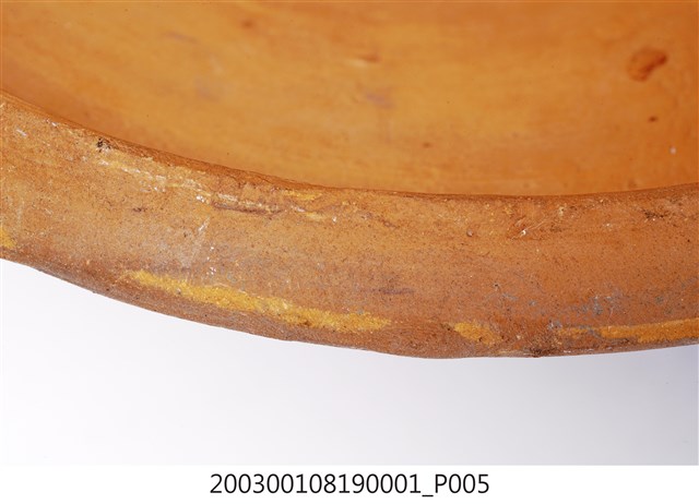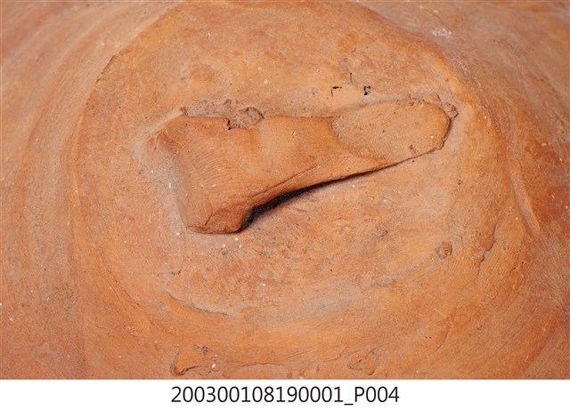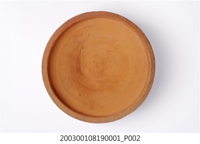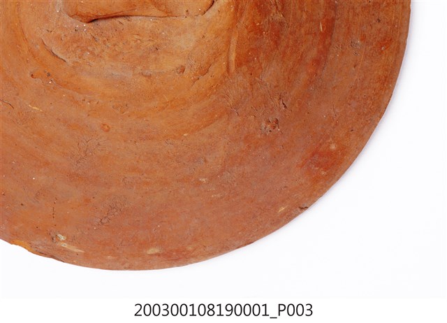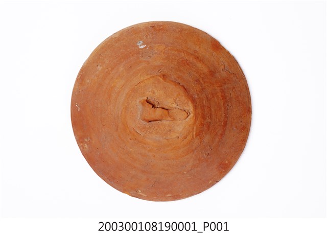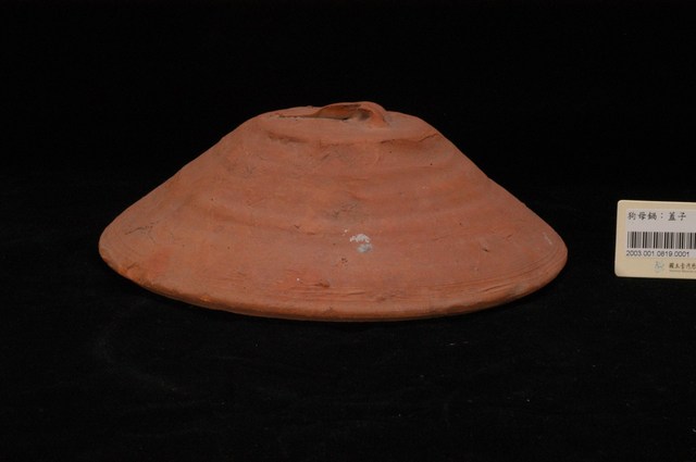 炊煮用陶鍋器蓋。胎質呈紅橙色,頂部平坦,下擺為斜直線,呈倒斗笠形,蓋面中央黏以小土條作為蓋紐,蓋外面可見轆轤拉坯,以及手捏修飾痕跡。與陶鍋器身2003.001.0819.0002配套。