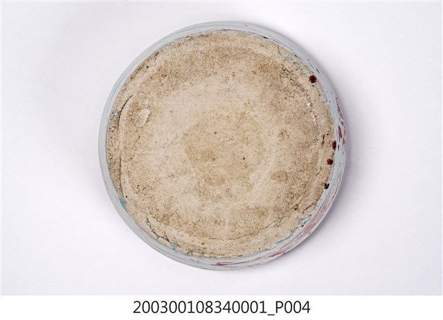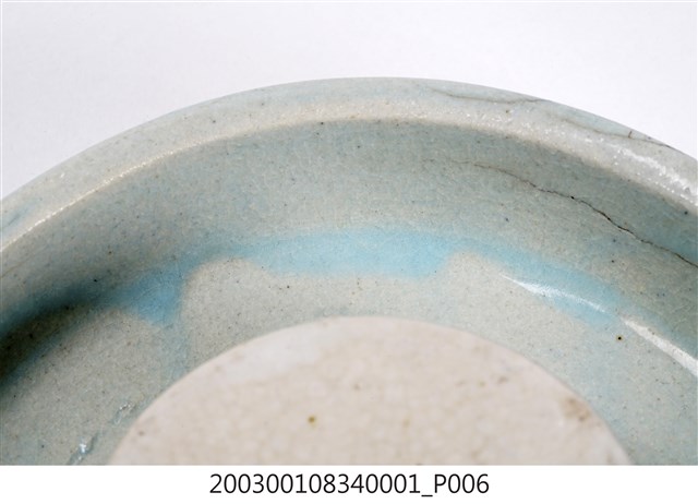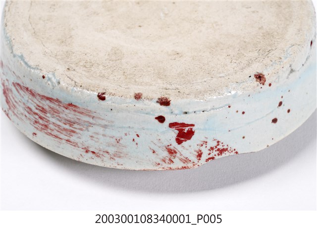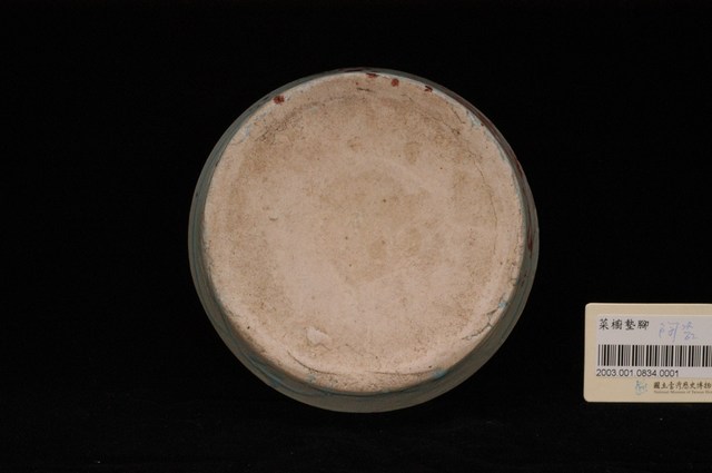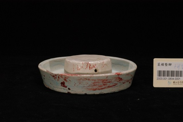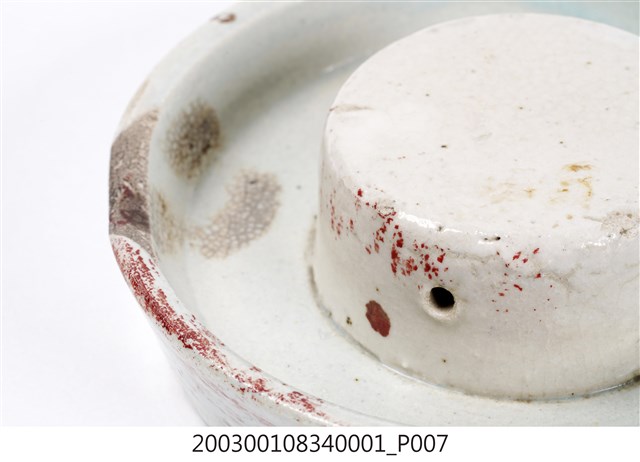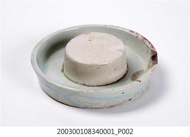 1. 本藏品為四件組圓形瓷製桌腳墊中的一件,長12.1公分、寬12.1公分、高3.3公分,器表施白透藍釉,胎體潔白緻密,器體規整,釉面光亮,但有部分紅色污漬,器底不施釉。器壁一角有破損,中央有圓柱形突起,圓柱上有一孔洞。2. 桌腳墊是漢人傳統廚房中常見的器具,餐桌與菜櫥的四足會架在「桌腳墊」上,並將一圈凹槽注入清水,其作用除了是將家具墊高,隔絕地面濕氣侵害木料外,同時也透過清水阻絕害蟲,保護桌櫃中的食物,所以又被稱蟻除、櫥仔腳。桌腳墊多為方形或圓形,材質多元,有瓷製、陶製、石製等。