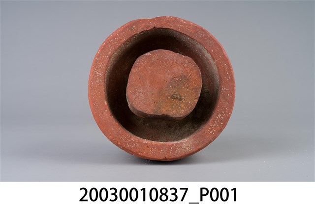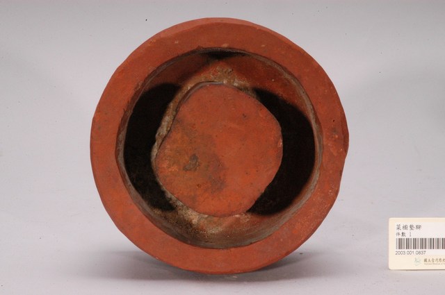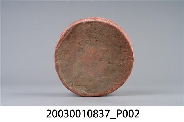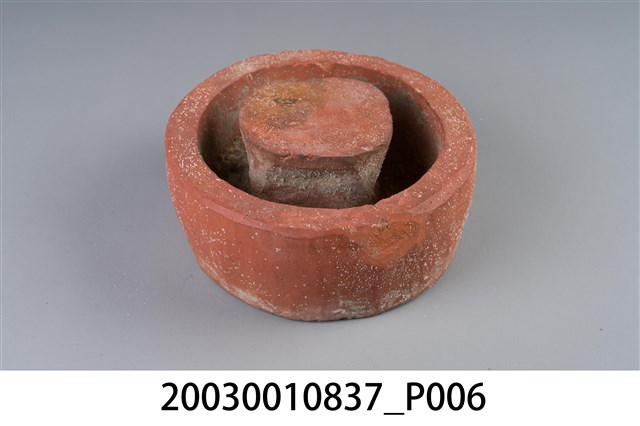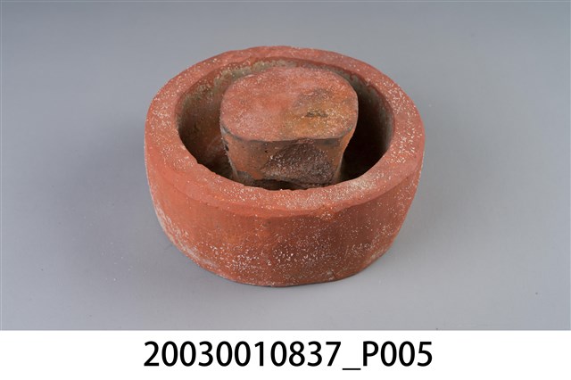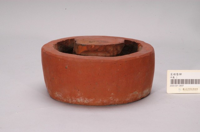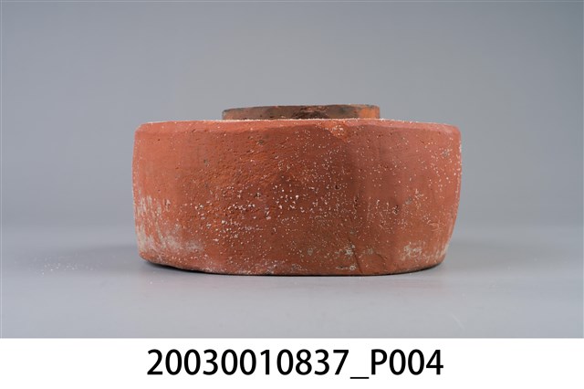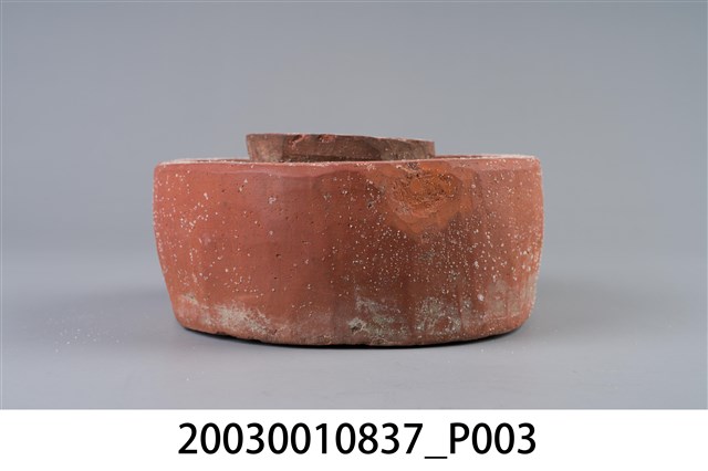 1. 本件為圓形素燒紅陶桌腳墊,長17公分、寬16.8公分、高8.1公分,胎體緻密,質似紅磚,不施釉,外圍器壁為不規整的圓形,中間凸起為不規則方柱形。2. 桌腳墊是傳統廚房防蟲用具,器形以方形、圓形為多,質材多元,有陶製、瓷製、石製等。將櫥櫃、餐桌四足各立於桌腳墊上,溝槽承水防止害蟲入侵,是故又被稱為蟻除、櫥仔腳。本件此類質似紅磚的素燒紅陶,以臺南「歸仁窯」最為人所知,推斷本件即屬此地所產。