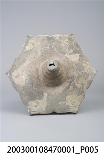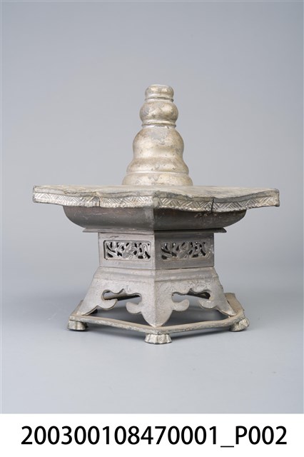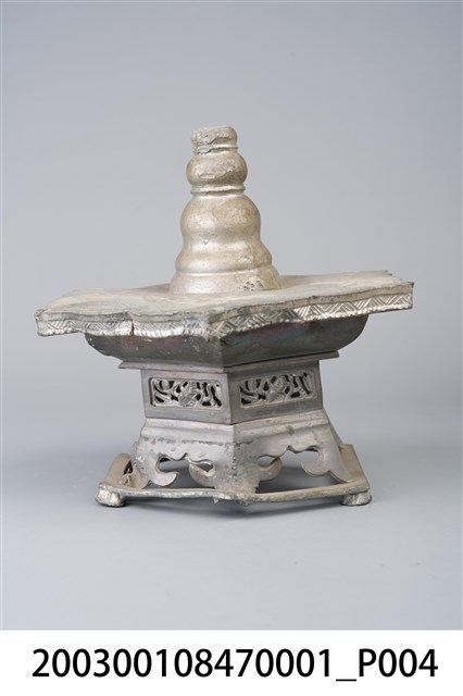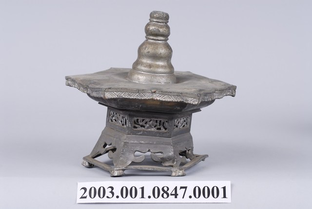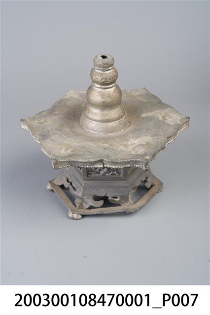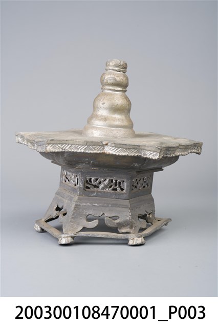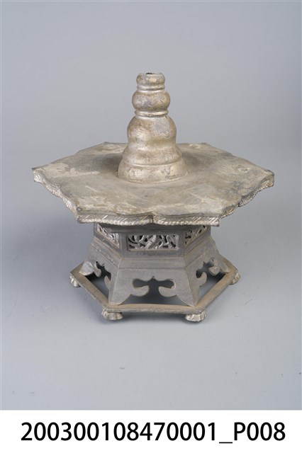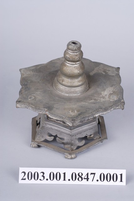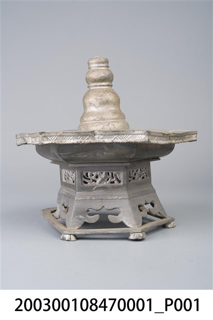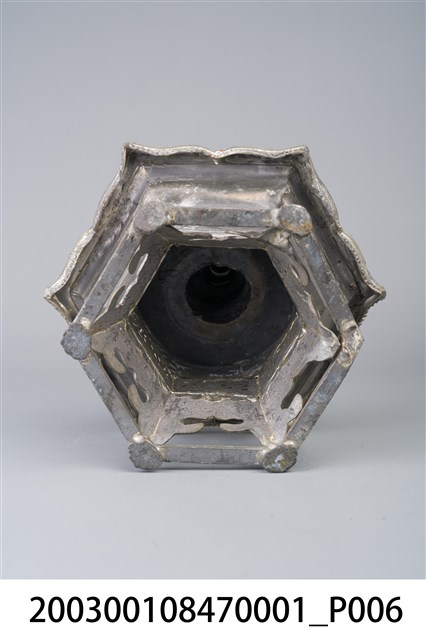 本件錫製六角菱花口燭臺為2件成對之組件1,長16.1公分,寬14公分,高14.5公分,通身以錫製而成,樣式為單承盤。承盤作平面六角形菱花口緣,緣裙鏨金斜紋。承盤中心上置上窄下寬之球形立柱,柱頂開口,可插入燭籤,用以固定斗燭。底座同為六角形,開面以鏤空枝葉紋裝飾,腳飾六角尖狀如意雲頭,底加六腳環形足。由於錫金屬質地較軟,因此如意雲頭飾腳一側變形,燭臺略為歪斜。