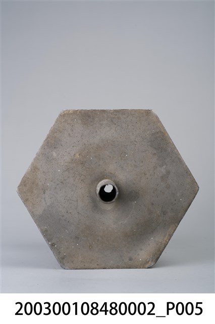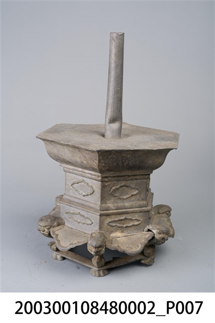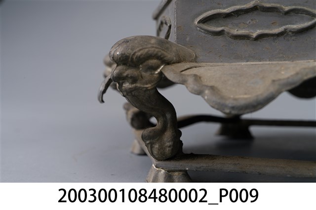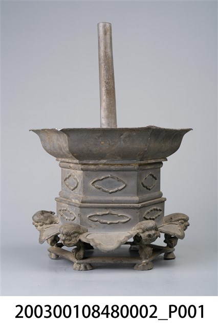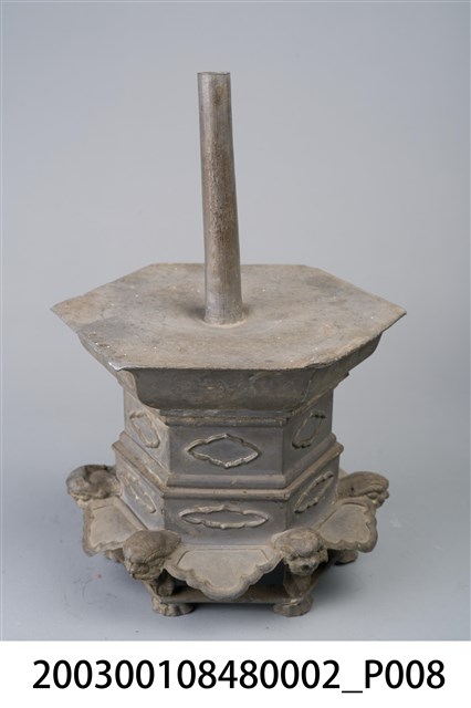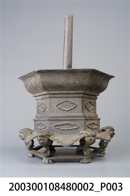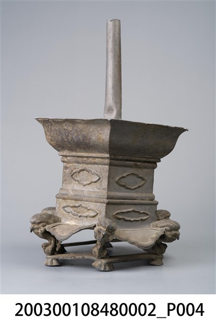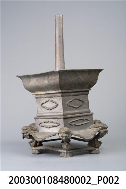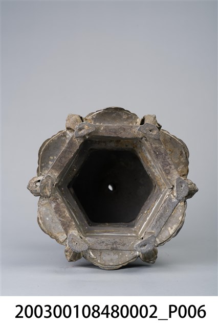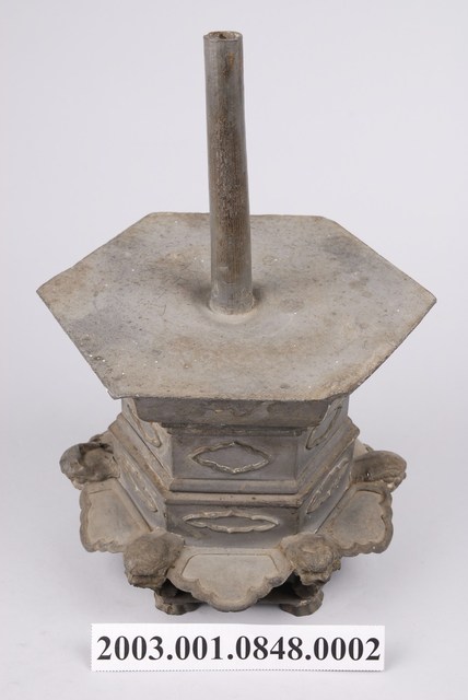 本件錫製六角虎首足燭臺為部件之2,長16.4公分,寬145.2公分,高23.5公分,通身以錫金屬製作,為單承盤樣式。承盤作上寬下窄之六角形盤狀,頂面為平面,中央處帶有中空柱狀之燭籤,作套管式使用,可將長形斗燭套入固定。底座為3層樣式皆為六角型,上層與中層為六角形扁柱,各開面皆作菱花口凸紋裝飾。下層為六腳虎首足,足與足之間另以弧形如意紋作襯裙,底部加襯六角環形底足。