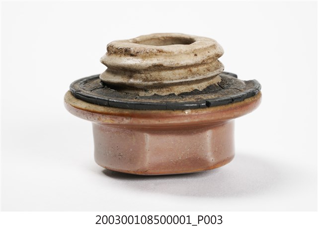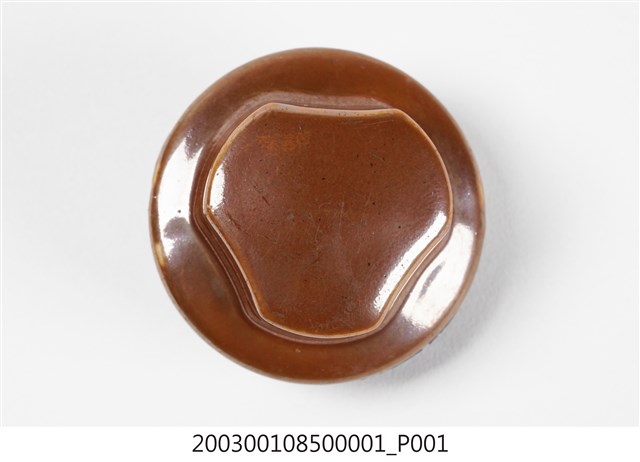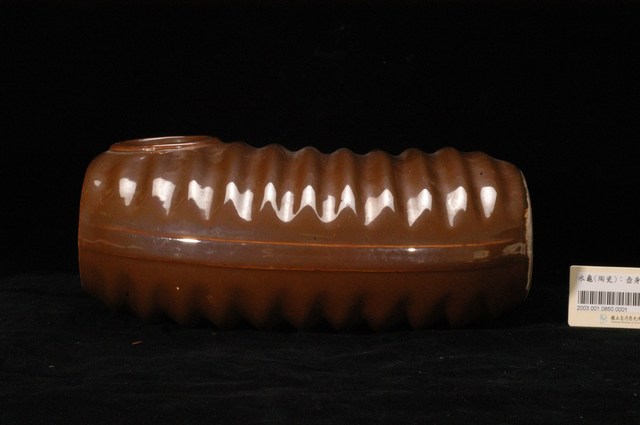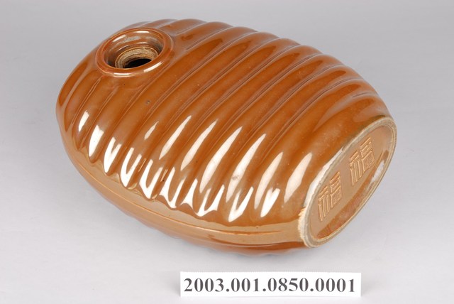 1.此為瓷製水龜,長約25公分,寬約21.8公分,高約10.3公分。此水龜含器身及器蓋。器身上黃褐色釉料,寬幅上下兩面設計水平波浪紋,以突起橫幅稜線紋連接,可增添光澤。器身底部刻有福福二字,字體邊緣有些微落漆。於器身肩部鑿一圓孔洞,附螺紋可栓入器蓋。整體保存完整,僅些微刮傷。2.水龜多為鋁製或陶製扁平橢圓器具,形似龜殼故得此名,做為保暖或保冷用途。使用時旋開器蓋,注入燒開熱水後鎖緊,裹以棉布避免觸碰燙傷,就寢前放置於被襖中,做為暖床之效。翌日晨間可利用壺內水之餘溫盥洗,是冬日保暖的重要器具。水龜另可倒入涼水或碎冰做為冰枕,可消退感冒發燒症狀,達到降溫效果。