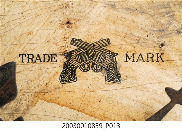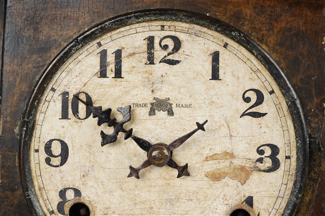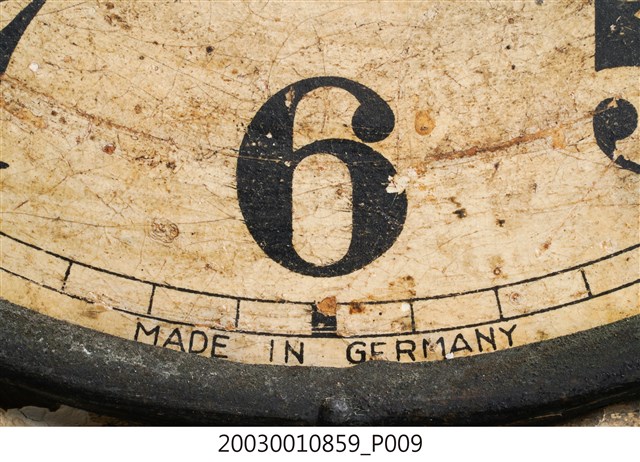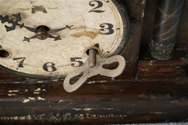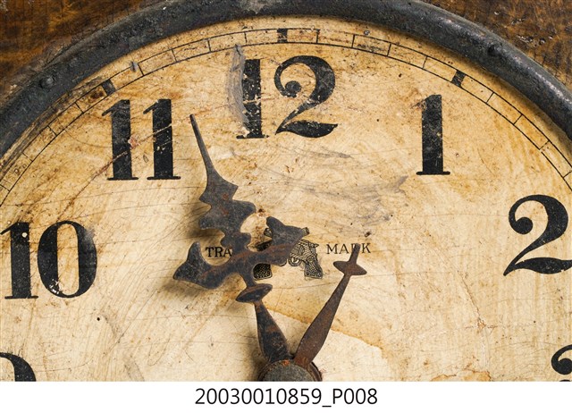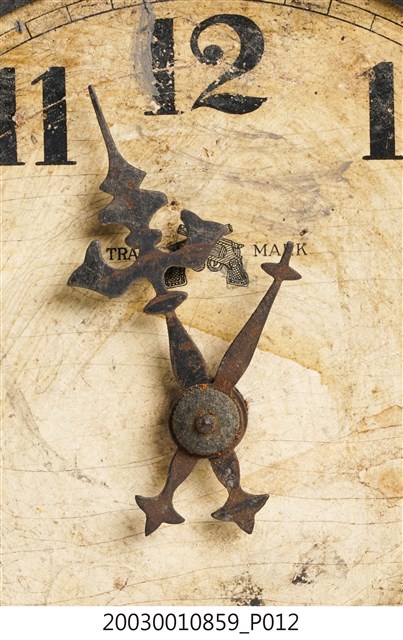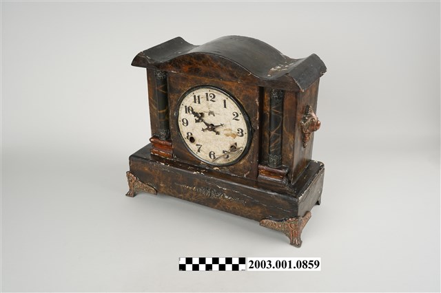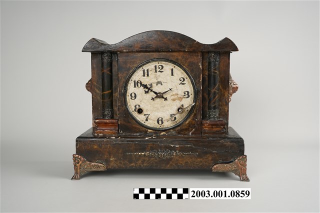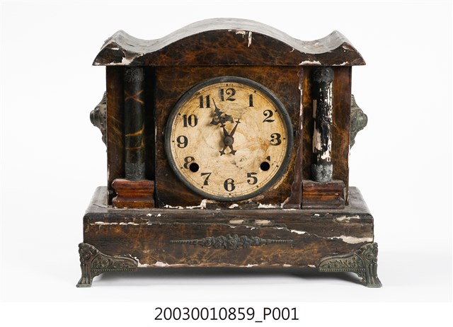 1. 本件德國製仿石紋木座鐘以木材製成盒體,外型呈橫向扁平之長方體。頂蓋中央隆起、兩側下凹,呈圓弧造型;底座略寬於主體,為長方形構造,並設有四足支撐。正面左右兩側飾以立體圓柱,中部設有圓形文字板,覆以圓形透明玻璃。時間以阿拉伯數字1至12標示,數字12下方印有「TRADE MARK」字樣,惟商標圖樣已不清晰;數字6下方邊緣可見「MADE IN GERMANY」小字;數字8與4對應位置設有發條上鍊孔,發條可拔出或插入,具活動性。