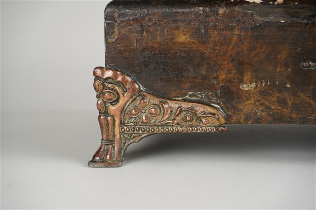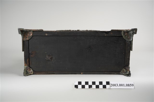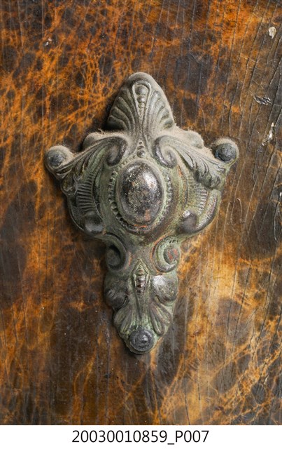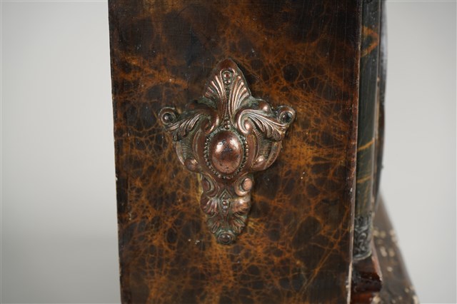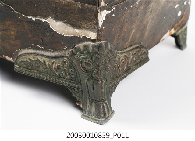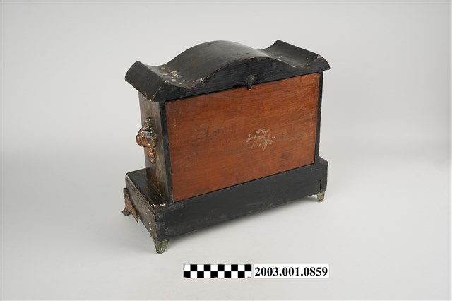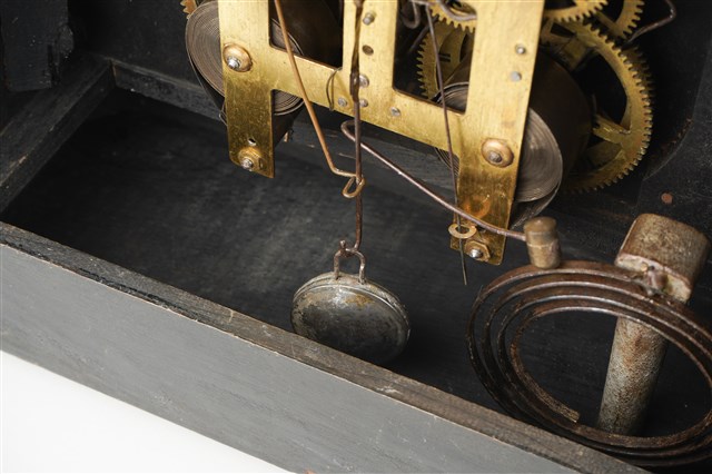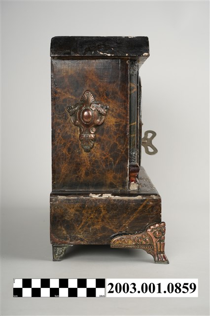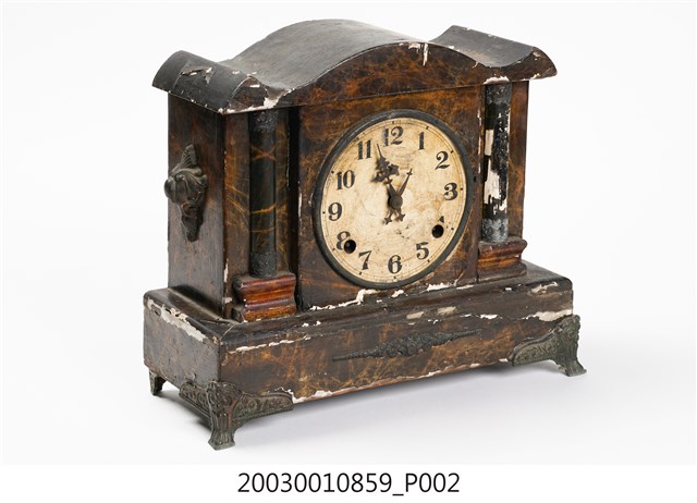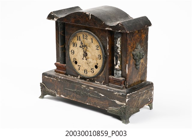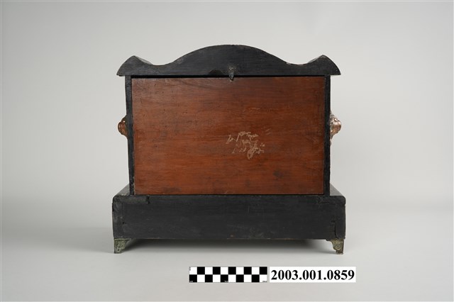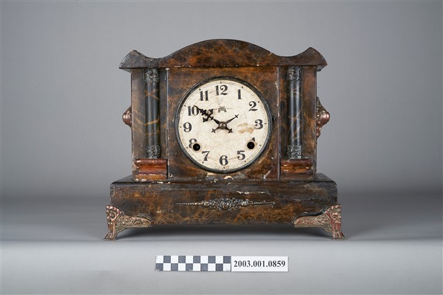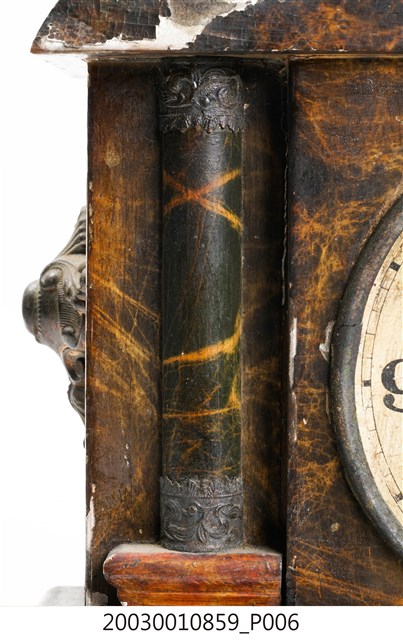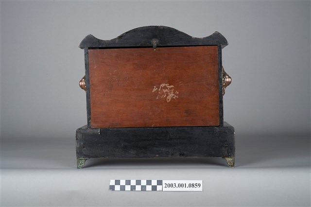 2. 鐘體除背面塗透明漆、底部塗黑漆外,其餘各面均以漆料仿製石材紋理,並於兩側面、圓柱上下端、座台中央正面及四足處,裝飾精緻銅片與銅製構件,增添整體裝飾質感。座鐘背面木板可開啟,內部可見黃銅齒輪等機械結構,近底部垂吊之鐘錘亦可活動,並可拆卸取下。