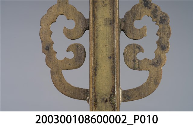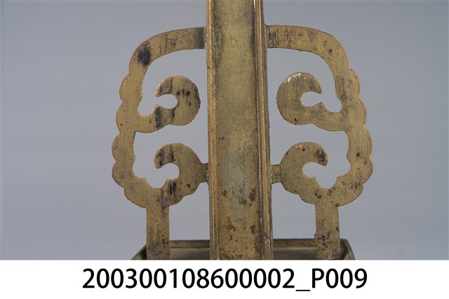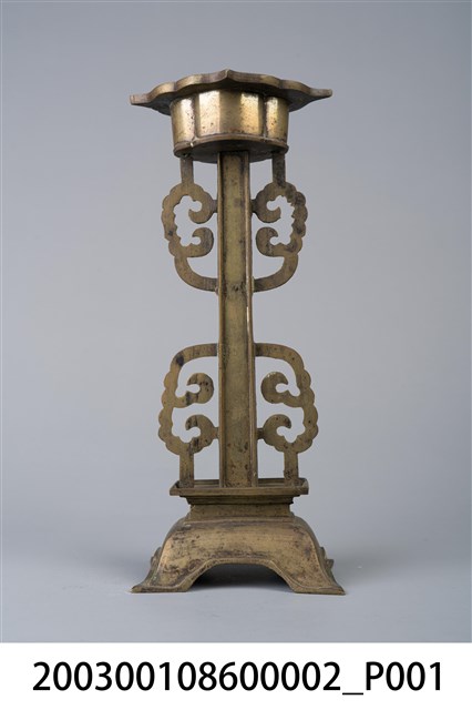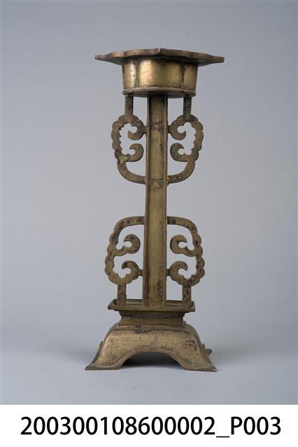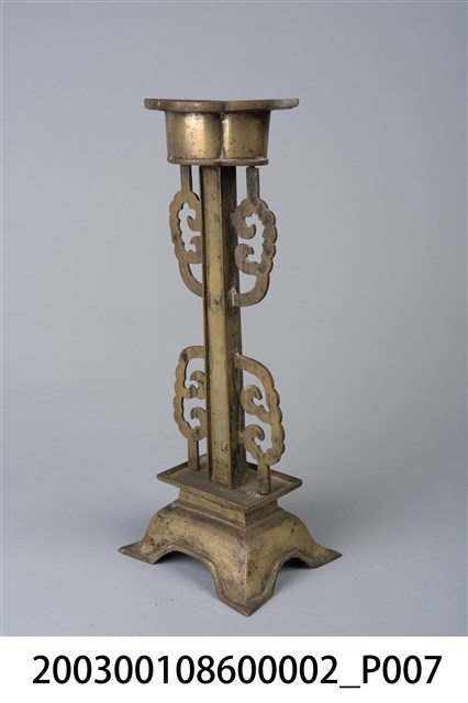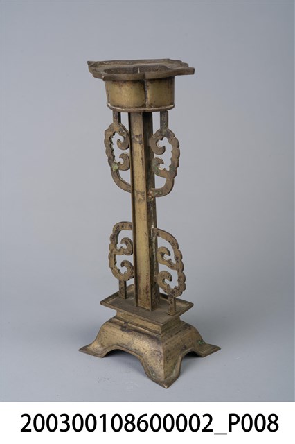 本件銅製捲雲紋立柱式燭臺為部件之2,長9.6公分,寬7.9公分,高22.1公分,通身以銅金屬製作,可分為承盤、立柱與承座3部分。燭盤作海棠式器身,口緣折沿另作菱花口形。燭盤下接斷面為工字形立柱,立柱上下端皆作兩側邊對稱之捲雲紋。承座頂面作方形平面,四周帶唇突起,中段束腰,底為外敞四尖角足。