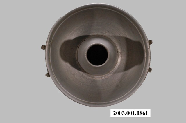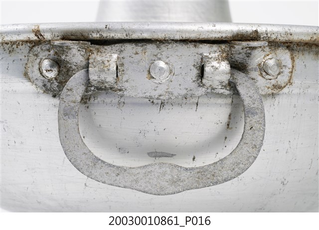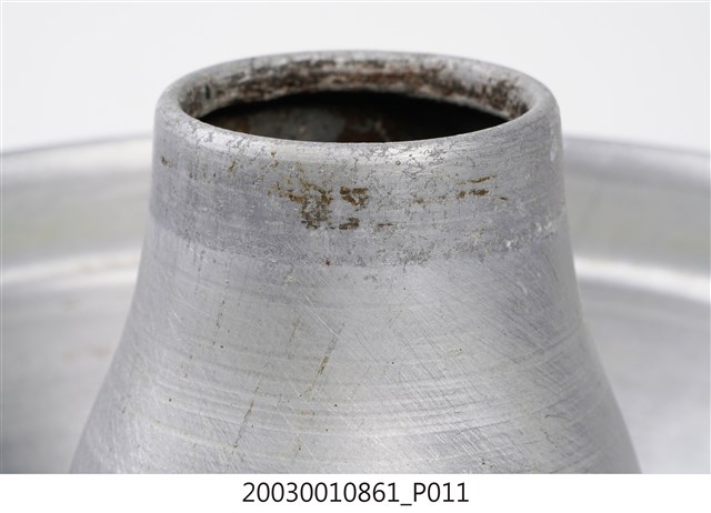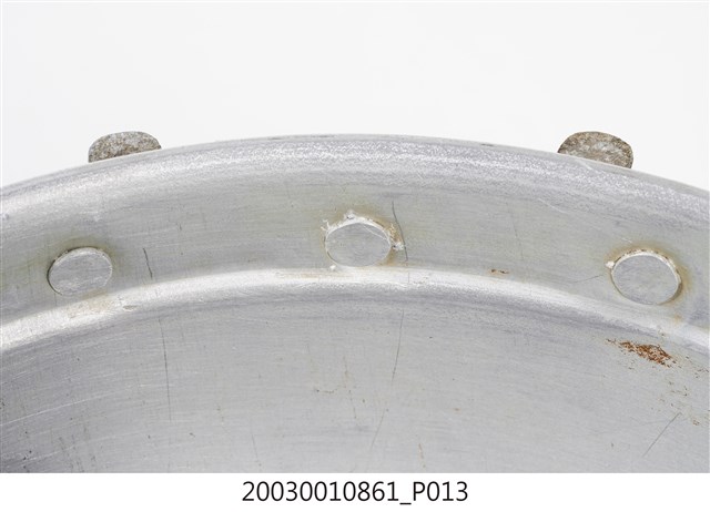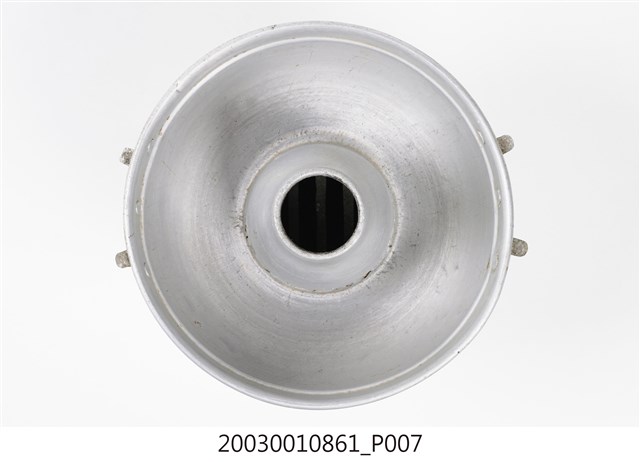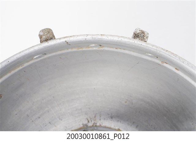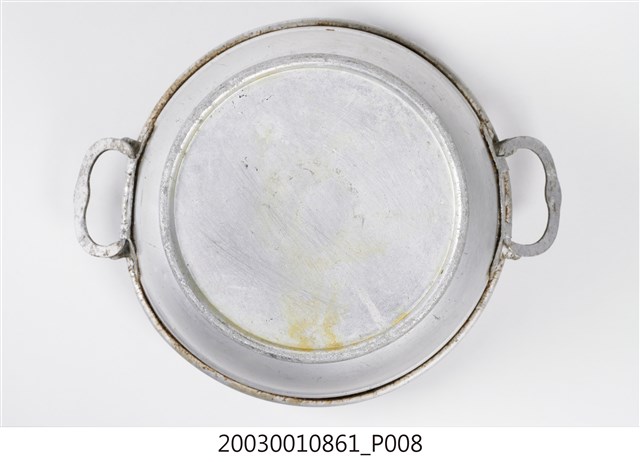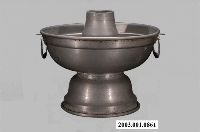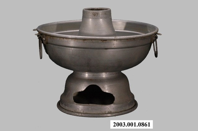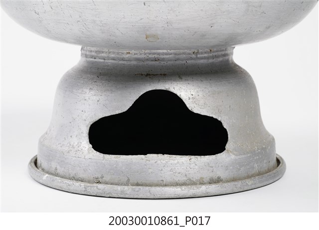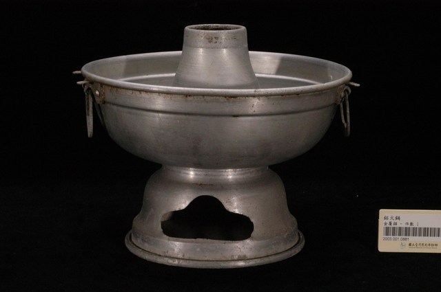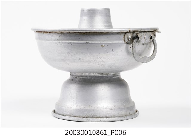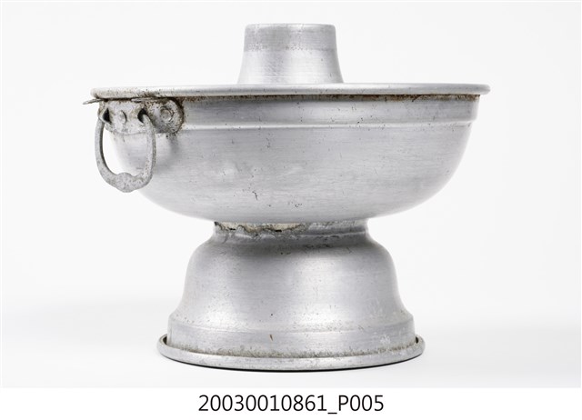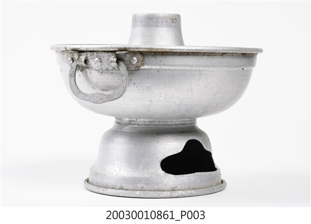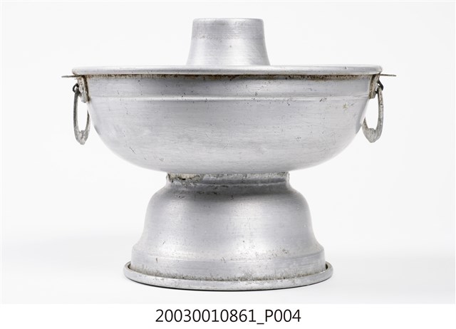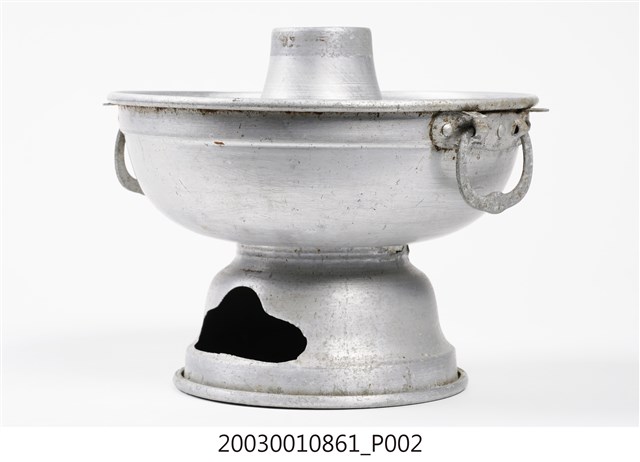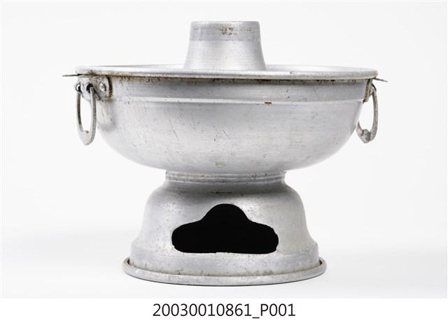1.本件鋁製炭燒火鍋通身皆以鋁金屬製作,鍋身內設置有炭室,使用木炭作為加熱來源。火鍋以鍋身中央帶有筒型的煙囪為特色,煙囪直通炭室,可增加對流,添加木炭時由煙囪開口放入,炭室底部則作鏤空,下接高足,側面作開口,內部可承接落灰,以及增加空氣對流效果。傳統火鍋多為銅材質製作,由於紅銅導熱性佳,可迅速加熱食材,但價格較為昂貴。相較鋁材較銅便宜,且臺灣1950年代多以鋁材製作的各式器具。2.火鍋常於冬季使用,家人圍於餐桌,將食材放入鍋中煮食後食用,也是傳統除夕夜圍爐鍋具。
