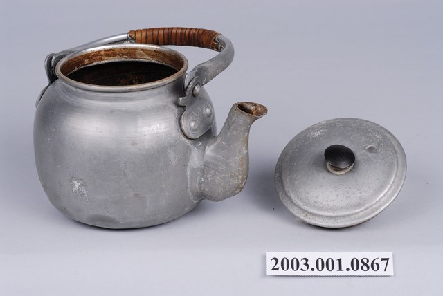 1.本件鋁製水壺可分為壺身與壺蓋2部件,皆以鋁金屬製作而成。壺身呈平底鼓腹圓形,口緣呈圓形,邊緣帶有圓唇,流身呈一彎流樣式,流嘴處呈舌口狀,流身與器身帶有明顯交界,為明接款式。口緣兩側相對處以倒T形鋁片利用鉚釘固定,作ㄇ字形提樑式手把,手把上纏繞有籐篾片作止滑使用。器蓋頂面略為凸起,其口緣邊緣內折作圓唇,為壓蓋樣式。頂面中心處則作黑色電木圓鈕。2.水壺主要功能是裝飲用開水和茶水,傳統多以陶、瓷、金屬,如鐵、錫、銅製作,臺灣於1950年左右流行鋁製的水壺。1970年代以後則盛行不銹鋼與琺瑯水壺。