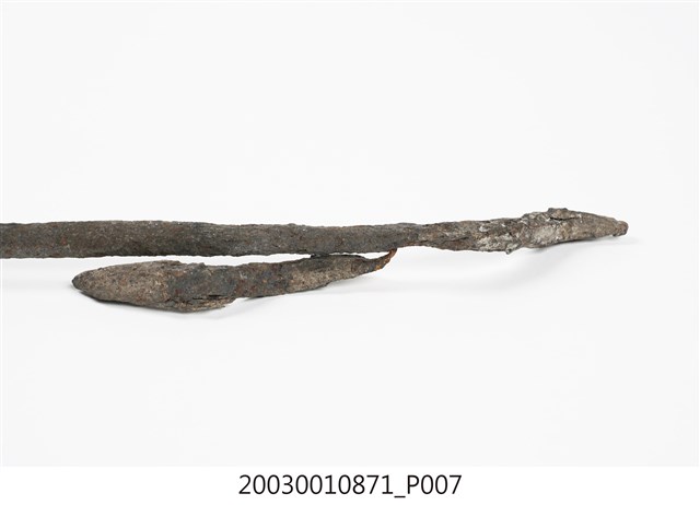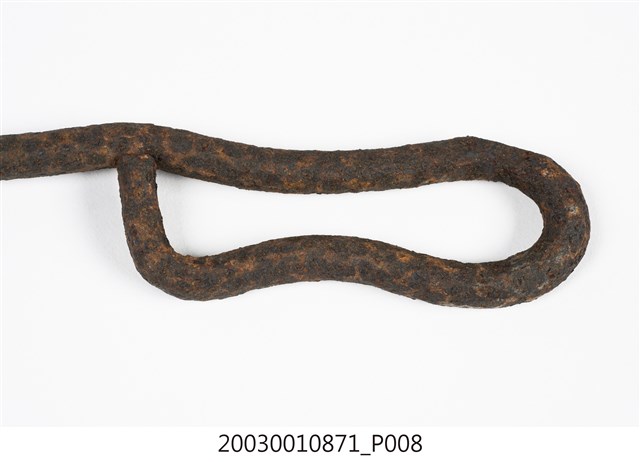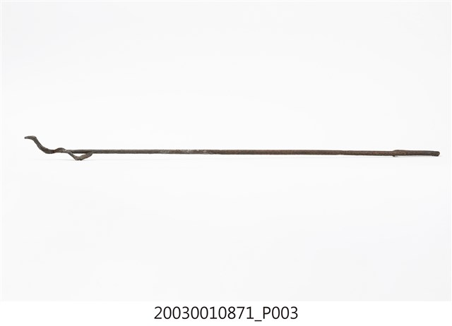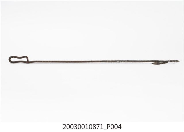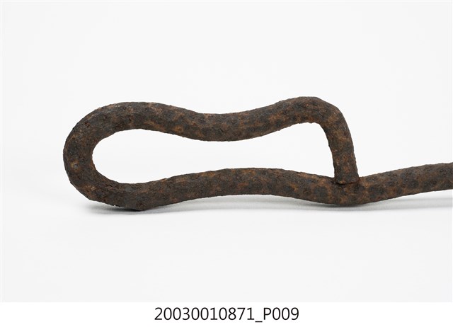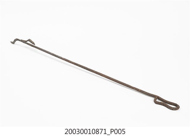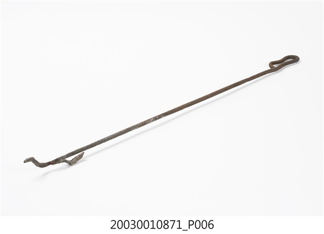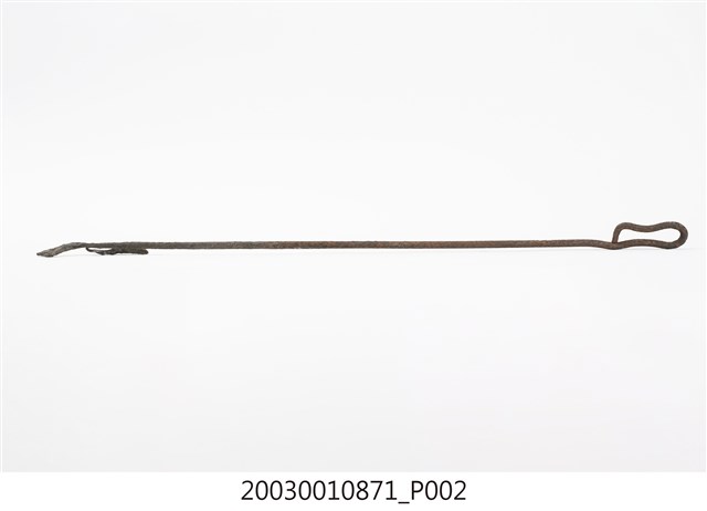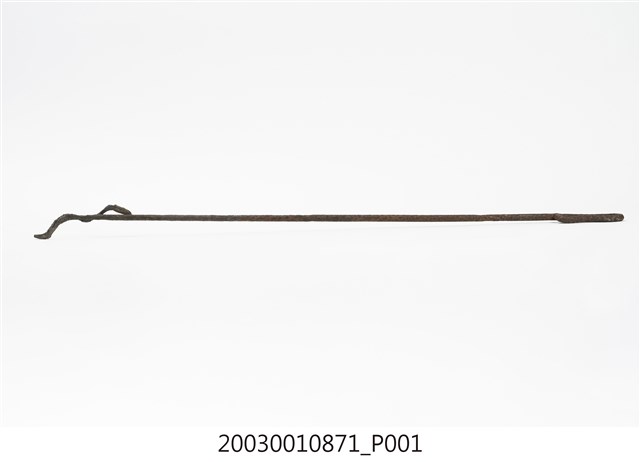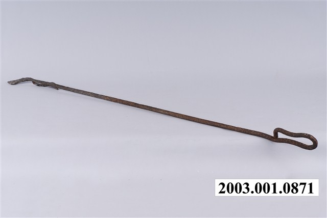 1.本件撥炭鐵鉤通身以鐵製作,呈長83.6公分,寬3.2公分,高4.7公分之長形棒狀物。鐵鉤外觀深褐色,表面滿布鏽痕,前端嚴重鏽蝕。外形為呈長條狀,尾端拗製成耳狀線條,前端處分岔出兩道彎曲鉤形,其中一隻鉤爪已變形。2.本件撥炭鐵鉤主要用於爐灶、暖爐等需要炭火薪材燃燒的地方,利用前端的尖鉤移動燃燒中的炭火,可添加炭火,也可讓熱源平均分布或是調節火力。