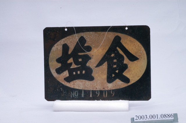 本物件為長方形黑色鐵牌,上有楕圓形圖案標有黑色「食塩」二字,並標示「No11909」,上有二小洞可供吊掛,正反面設計一致,唯其中一面已呈鏽蝕。