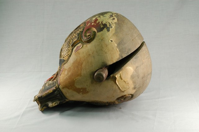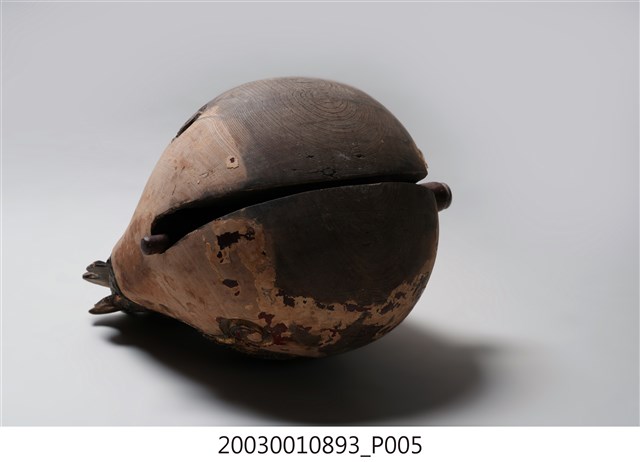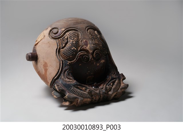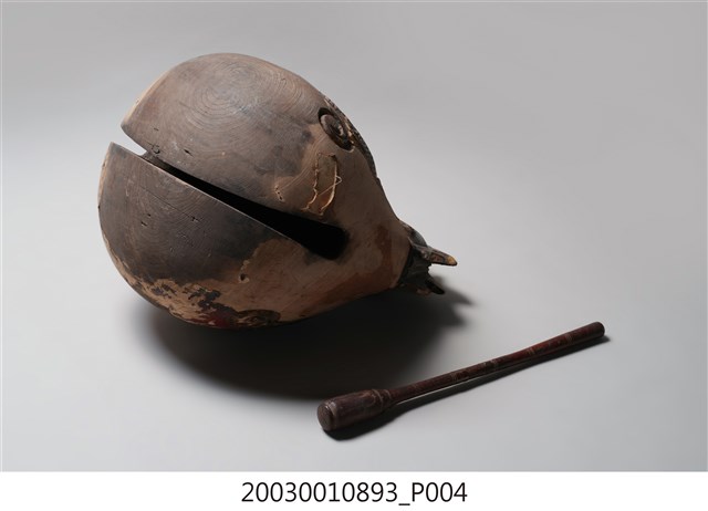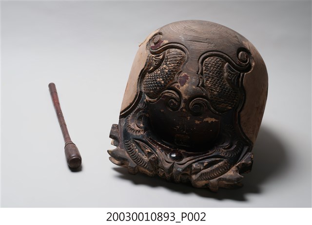 本組木魚在前端有一直條形缺口,開口並逐漸向兩端擴大,插有一支敲打用的木柄,內部則挖空。造形上在後端雕刻有兩隻嘴部相接的龍頭,兩龍共啣一顆珠,中央部位則有兩片左右對稱的麟狀紋飾,以及陰刻曲線捲紋。木魚供敲打部份在表面施有朱漆,漆面經敲打已嚴重脫落,僅在上下兩端存有局部漆面,後端龍頭及鱗片紋樣處則施黑漆。