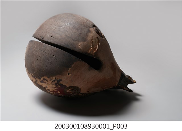 本組木魚在前端有一直條形缺口,開口並逐漸向兩端擴大,插有一支敲打用的木柄,內部則挖空。造形上在後端雕刻有兩隻嘴部相接的龍頭,兩龍共啣一顆珠,中央部位則有兩片左右對稱的麟狀紋飾,以及陰刻曲線捲紋。木魚供敲打部份在表面施有朱漆,漆面經敲打已嚴重脫落,僅在上下兩端存有局部漆面,後端龍頭及鱗片紋樣處則施黑漆。