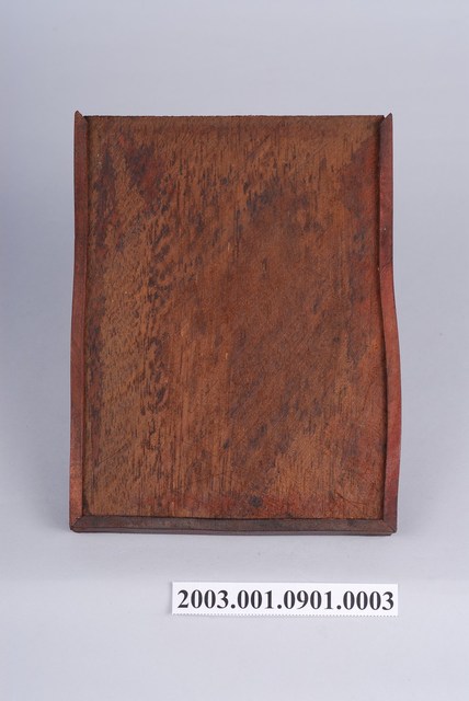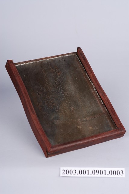 本件為彩繪玻璃雙提把乾漆鏡箱的鏡板,長為13.6公分,寬17.8公分,高1.8公分,形制上為長方形木框鑲上長方形鏡子與底板,木框以榫卯接合,木框底部兩側做有凸鈕,用以嵌入箱體最上層的溝槽。使用時將鏡板拉出上推擺放,收納時將鏡板闔下,推入箱體內。木材整體施以乾漆,而無其餘裝飾,給人簡潔實用之感。前鏡面氧化磨損嚴重,反射功能不佳
