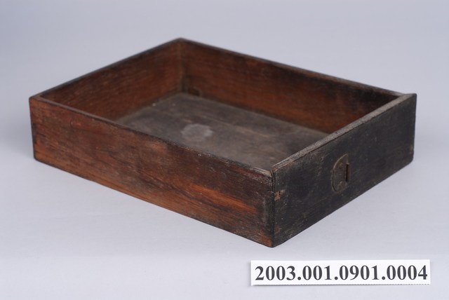 本藏品為玻璃雙提把乾漆鏡箱的兩個抽屜之一,為放置在箱體中間層的上抽屜,長為13.9公分,寬18.5公分,高4.4公分。若要使用時,必須先將鏡箱的倒L形闔板揭開,才能拉出抽屜。抽屜各板面以榫卯接合,通體內外施乾漆,正面已不見拉把或屜環蹤跡,僅以兩釘固定一半圓形金屬片,疑原為固定拉把之用。抽屜整體沒有施做裝飾,給人簡單實用之感。