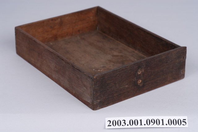 本藏品為玻璃雙提把乾漆鏡箱的兩個抽屜之一,為放置在箱體最下層的下抽屜,長為13.9公分,寬18.7公分,高4.3公分。若要使用時,必須先將鏡箱的倒L形闔板揭開,才能拉出抽屜。抽屜各板面以榫卯接合,通體內外施乾漆,正面已不見拉把或屜環蹤跡,僅在正面留有兩個釘孔及半圓形物件痕跡,疑原為固定拉把之用。抽屜整體沒有施做裝飾,給人簡單實用之感。