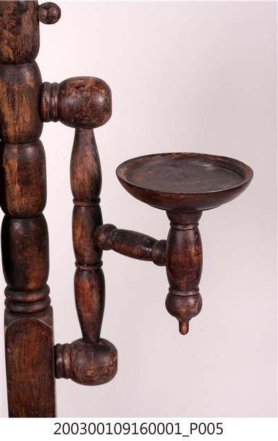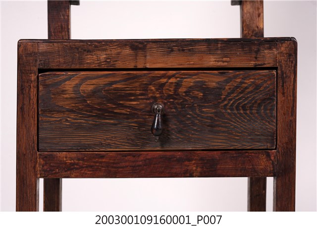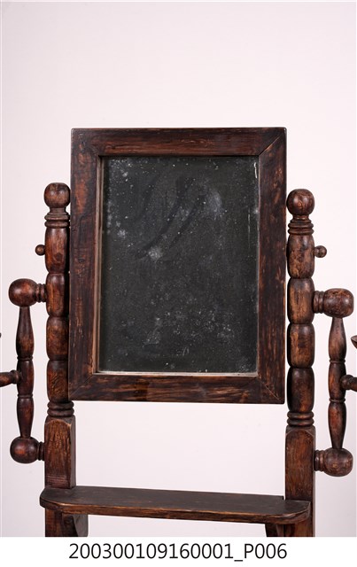 1. 本藏品為乾漆車枳梳妝臺之本體,長67.3公分、寬36.5公分、高133.1公分,依其部位可分為鏡屏與桌子兩個部分,鏡屏以兩個車枳立柱為中心,上端中央鑲有方形鏡子一枚,鏡子下方則有平板置物架,車枳立柱的兩側各有車枳短柱組成的可活動置物架,形似燭台。桌子的部分造型則相對簡單,方形的桌面下有一個抽屜,方直修長四柱,側邊有橫棖,兩根棖木之間則有腳踏板。