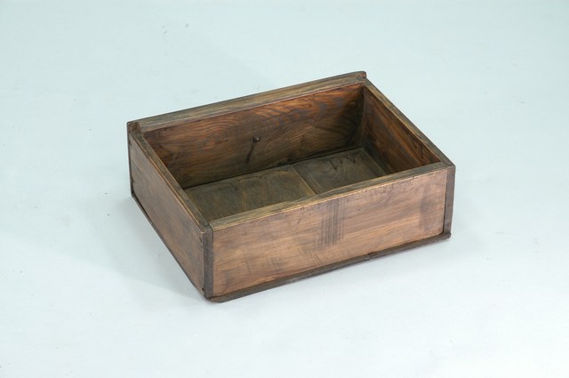 1. 本件為乾漆車枳梳妝臺之抽屜,長29.6公分、寬21.7公分、高10公分,位於該梳妝臺方形桌面下,造型為簡單的長方形,面寬深窄,側見可見釘眼,底板為兩片木板組成,抽屜通體施乾漆,器身木紋清晰可見,正面中央做有一個金屬拉把,以方便拉出,整體給人簡潔實用之感。