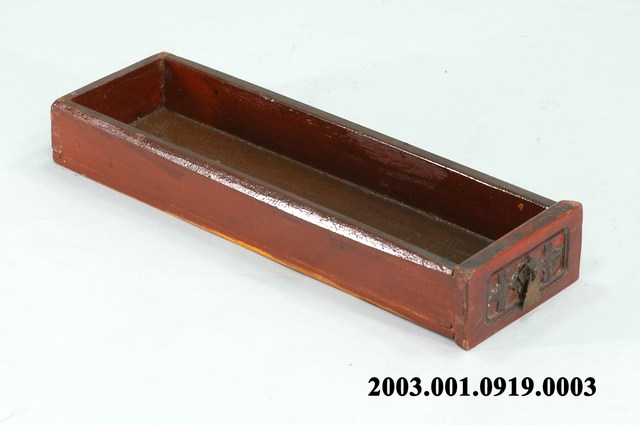 本文物為雕花梳妝箱右抽屜,位置在梳妝箱第二層,其外圍皆雕花並附有一拉環。該梳妝箱用途為放化妝品和髮簪等裝飾物品。女性臉上的妝扮為其對特定生活之想像,相對地女性之美也時常受限於社會傳統價值觀,妝扮女性的化妝品及其附屬產品,則體現了社會審美觀和科技的變動。