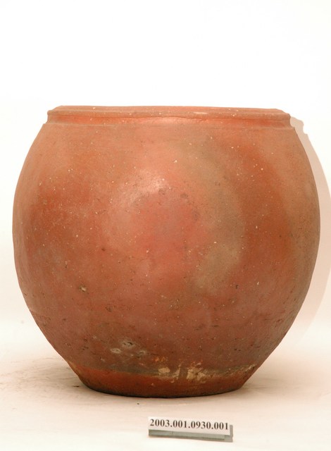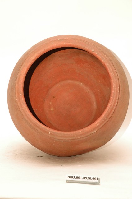 磚燒素面有蓋水缸(水缸),廣口,扁尖唇,短直頸,平底,器身渾圓,腹部中央以下圓弧內收,近底部為斜直狀。全器無釉,呈磚紅胎色,器身內外素面無紋,外器壁腹部有些許自然落灰雜質附著。