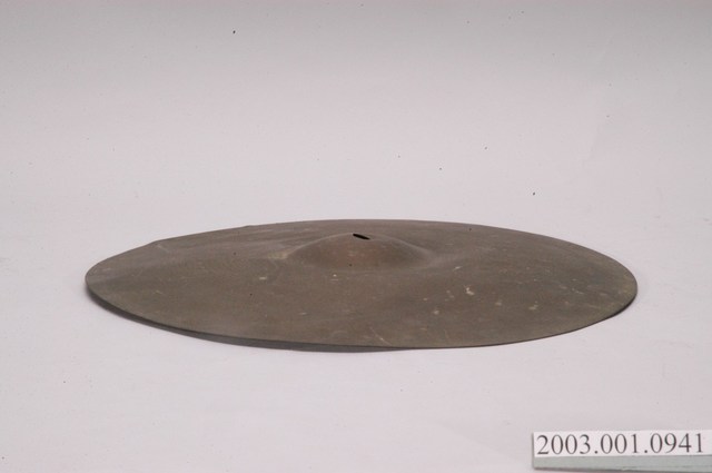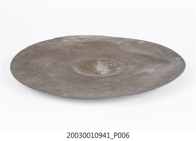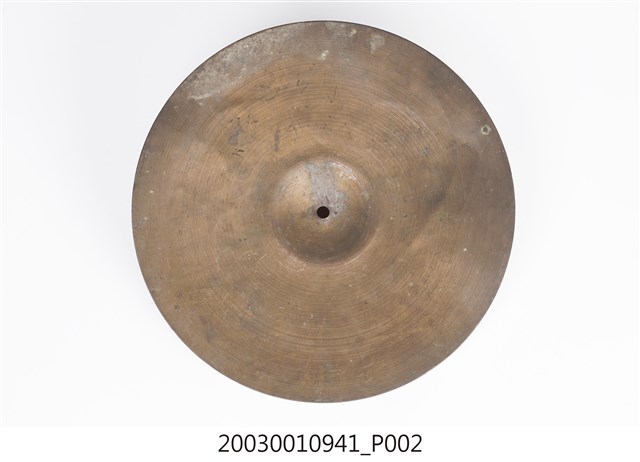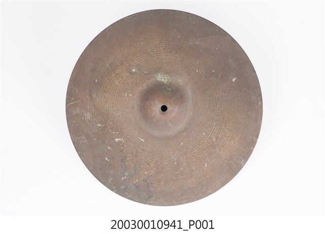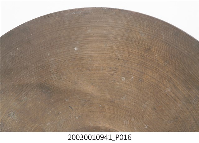 1. 本件為銅製拔,為單邊,鈸的形制完整,鈸頂處有洞但無握把,物件本身有刮痕和銹斑。