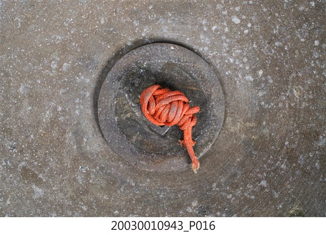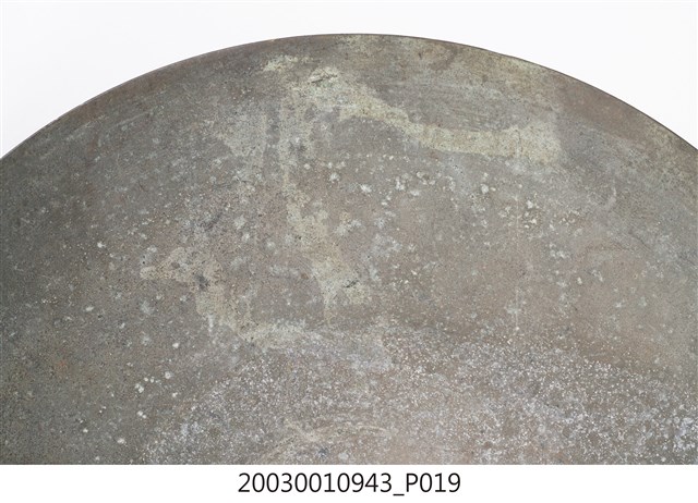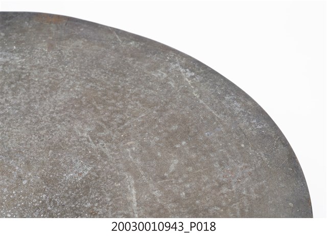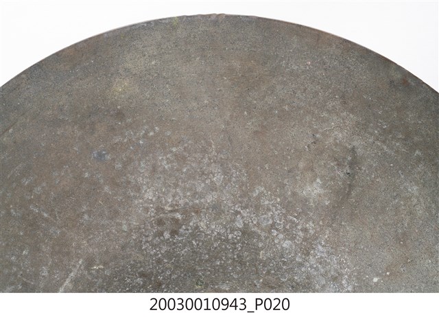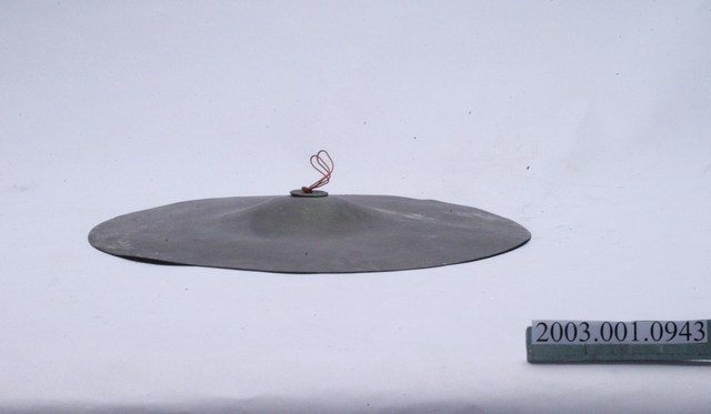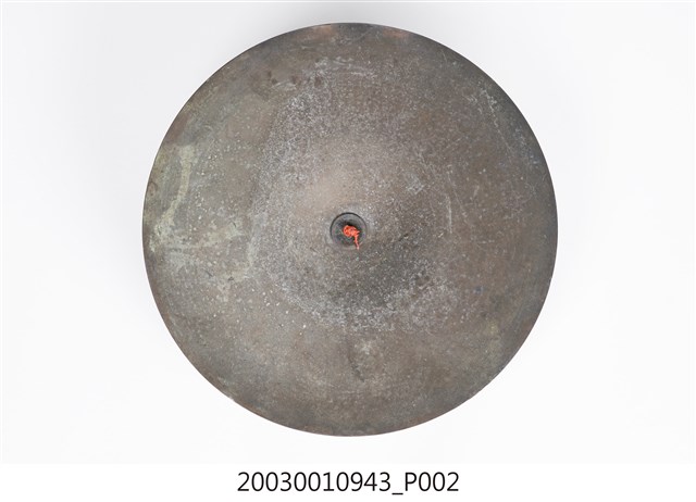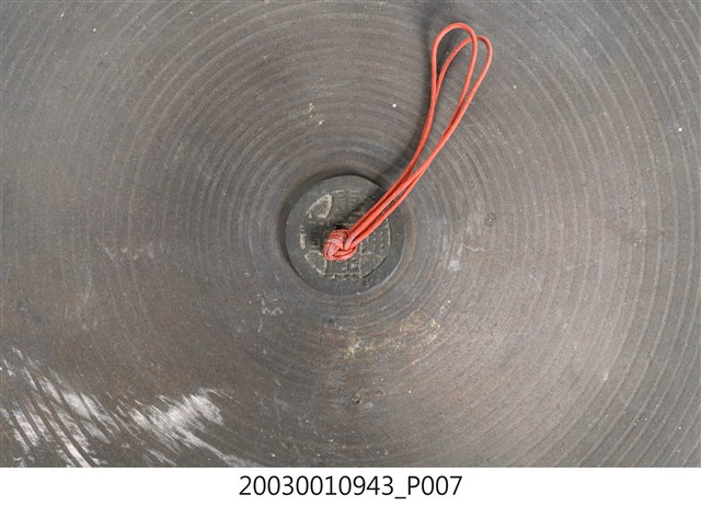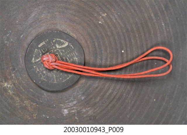 1. 本件為銅製拔,為單邊,鈸的形制完整,鈸頂處有紅繩作為握把,物件本身有些許磨損以及銹斑。