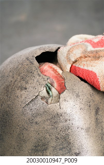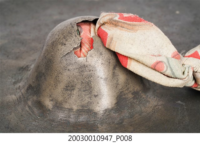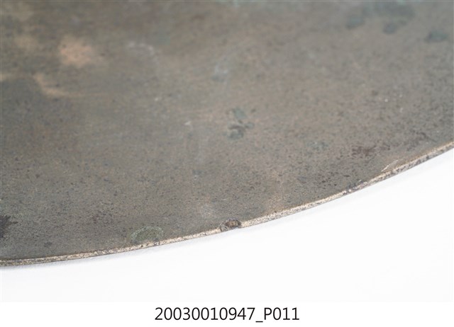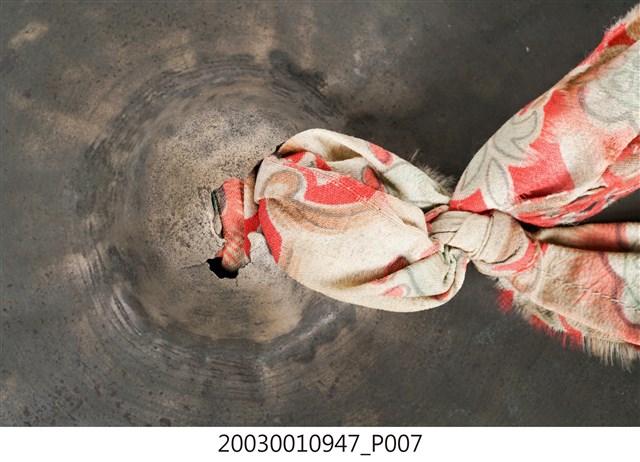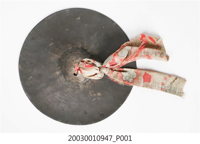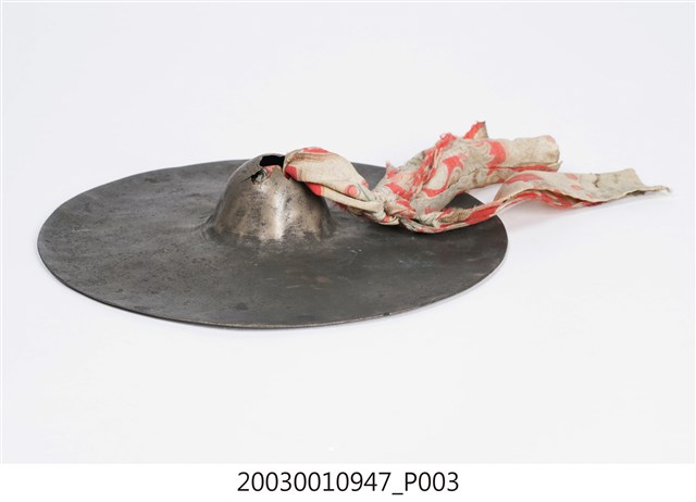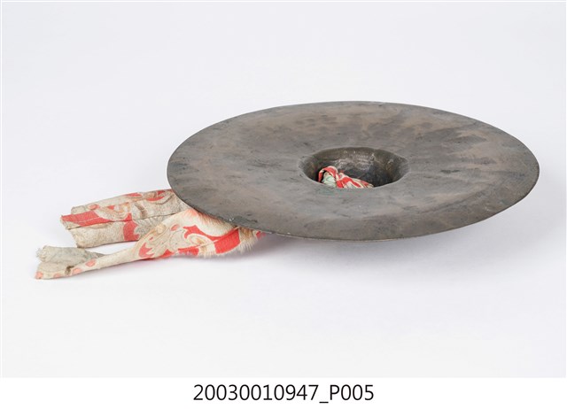 1. 本件為銅製拔,為單邊,鈸的形制完整,鈸頂處破損,以布巾作為握把,物件本身有磨損以及銹斑。