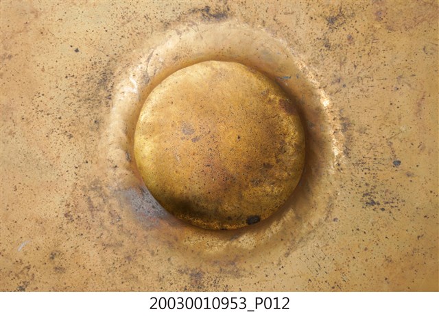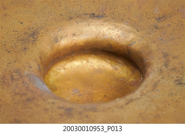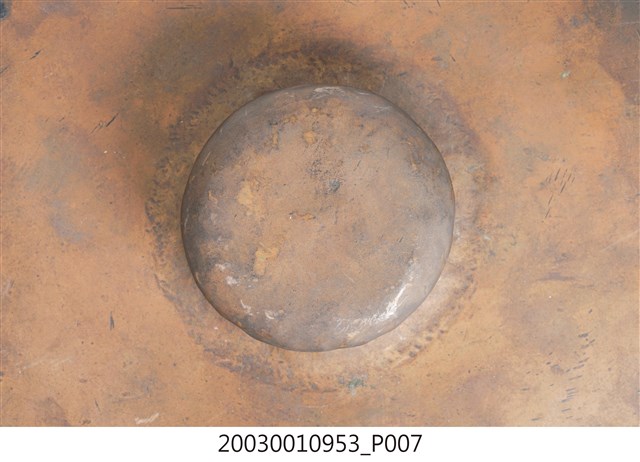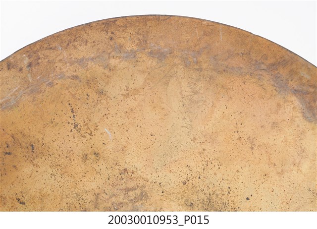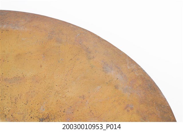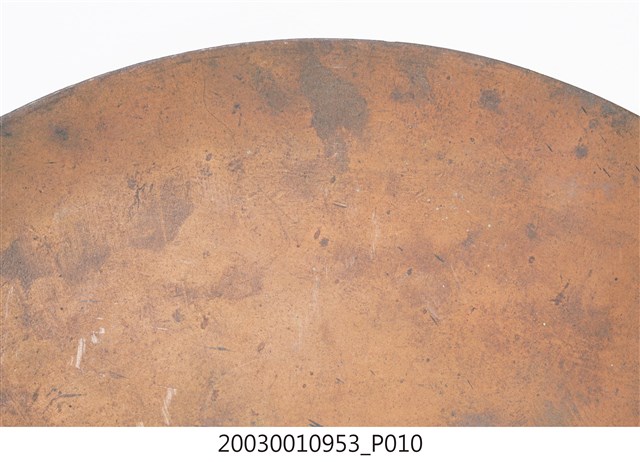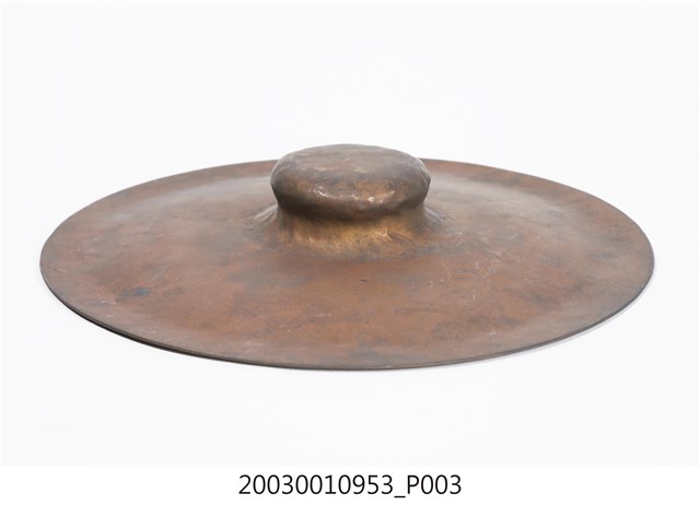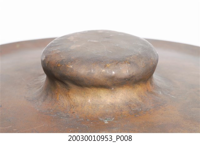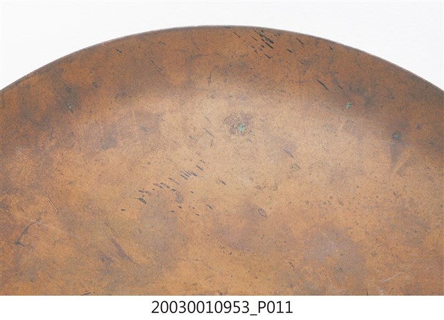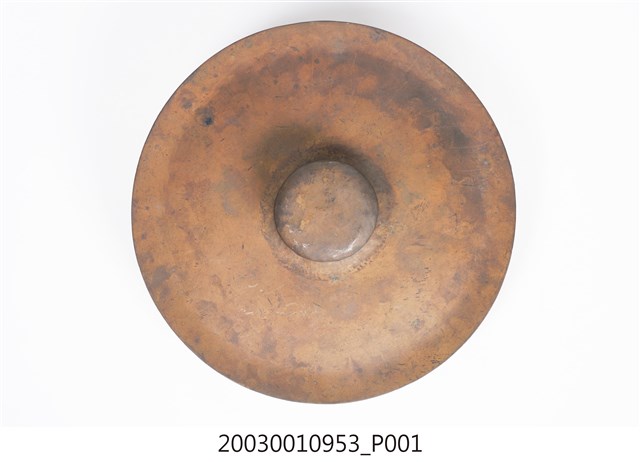 1. 本件為銅製鐃,為單邊,鐃的形制完整,鈸頂處無孔洞無法外加握把,物件本身有些許銹斑。