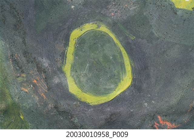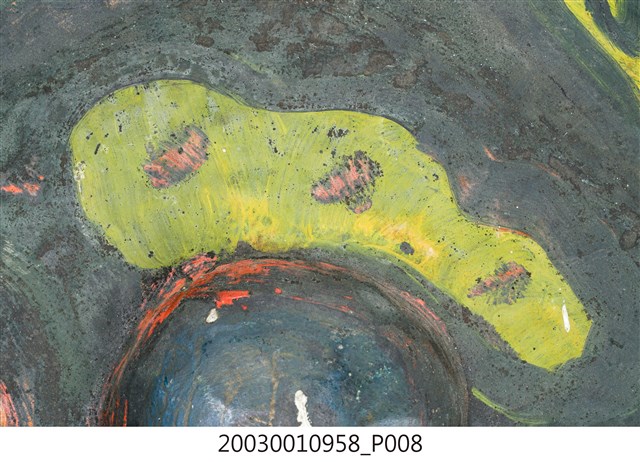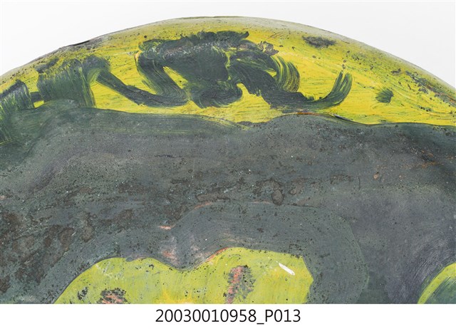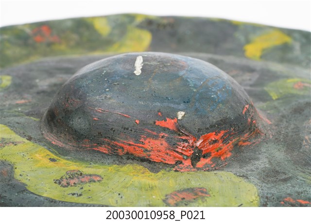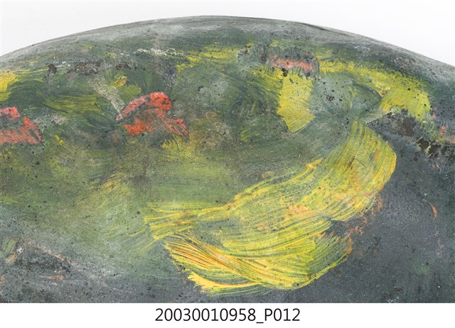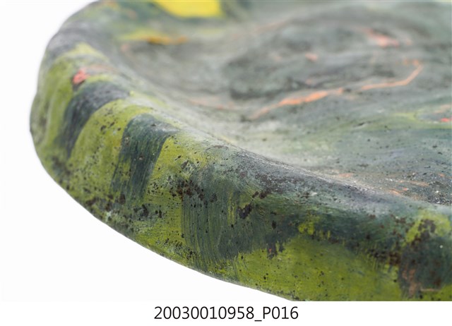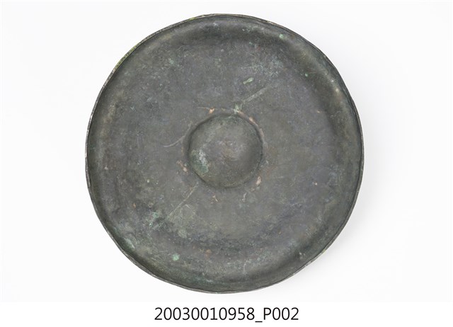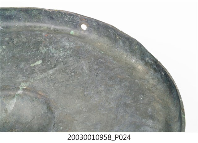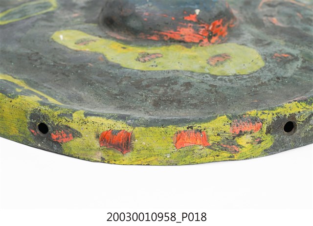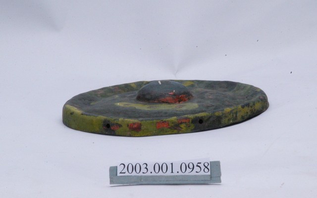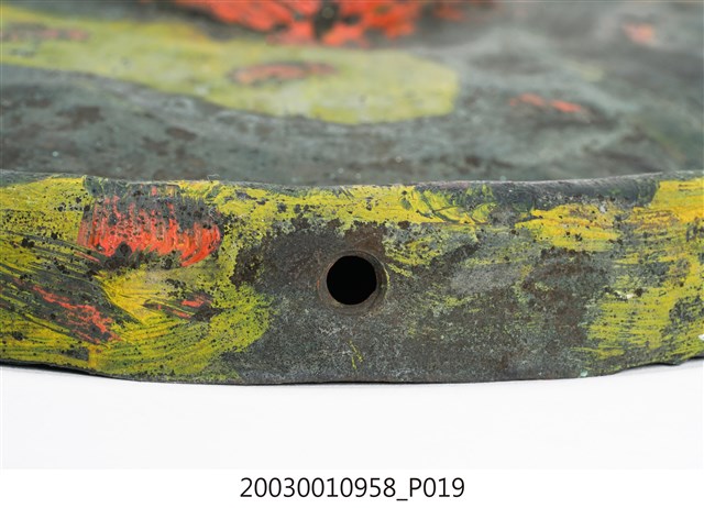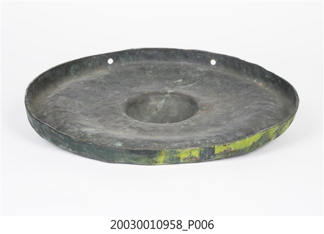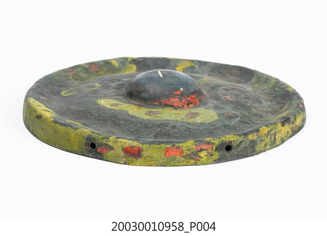 1. 本件為銅製鑼,鑼面為中間有突出鑼心的形式,本件有明顯銹斑以及磨痕,頂部有兩個孔洞作為吊掛使用。2. 鑼是銅製圓盤型樂器,依形制約可分為三種:一種是邊緣略向內彎,鑼面略高(此行為數最多,如京劇的大小鑼);一是邊緣呈90度彎曲,鑼面平滑(如:馬鑼、餅鑼);一種是鑼面中心有有突出鑼心(鑼乳),邊緣彎曲程度不一(如:北管大鑼)。3. 鑼的大小尺寸多樣,使用場合也非常廣。大型鑼(直徑達1公尺以上)通常懸掛於鑼架上,以包有橡膠或棉布的鑼錘擊奏,常用於鼓吹樂、戲劇後場、導迎性的儀仗樂隊。小型鑼(直徑為50公分以下)則用於鑼的邊緣鑿洞穿繩,由演奏者懸提,並以木棒擊奏,常用於戲劇或法事後場演奏。羅和鼓為華人民間樂團中經常彆列的兩件重要樂器。民間慶典或戲劇都少不了鑼鼓烘托熱鬧的氣氛,因而有"鑼鼓喧天"的形容詞。本物件樣式為中心有突出鑼心的形制。