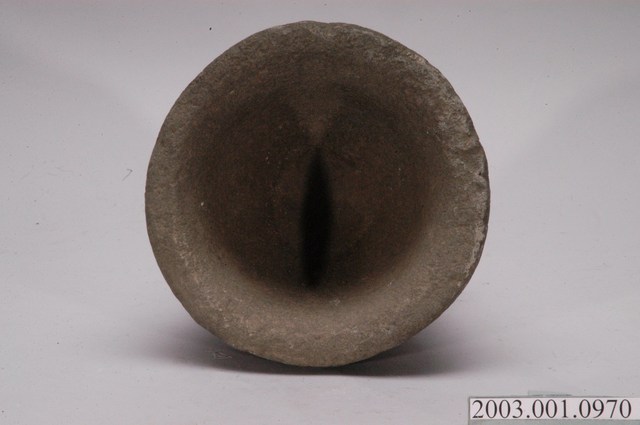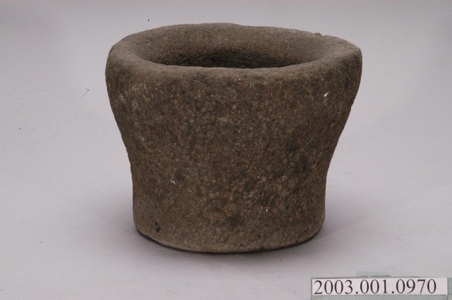 石臼外型呈現圓桶狀,由上部些微往底座內縮,形成上寬下窄的器型,不見成套的杵。製作方式將石材的中央雕鑿出半圓球狀的凹槽容器,用以裝盛加工處理的食材。石臼口緣處有些許剝落痕跡。