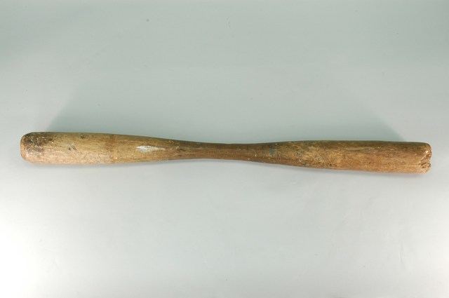 1.此件木杵是以一整根木料刨雕成細腰曲線的棒狀,兩端約略等長且較粗為杵頭,中間較細且較兩端杵頭略短處為握柄。因經久使用與年代久遠,兩端敲擊處的弧面有明顯磨損,杵身則有多處裂痕、刮削磨損、斑塊污漬等現象。2.此類棒狀木杵屬臺灣原住民族普遍使用的工具,雙手一上一下持拿中間握柄處,上下敲擊,大多與臼配合用來舂搗小米脫殼,或是將煮熟的小米經由不斷地舂搗後,製成具有黏性的傳統食物。