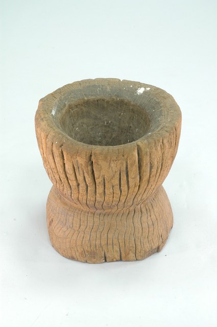 1.此件木臼以整塊木頭製成,從頂部中間凹挖成臼,臼內有刻鑿痕跡,臼身中間鑿刻出縮腰造型,狀似沙漏。因經久使用與年代久遠,臼頂邊緣處有明顯磨損痕跡,臼身內外皆有多處裂痕,臼身外的裂痕卻因此呈現出歲月的美感。2.此類縮腰式漏斗狀的木臼屬臺灣原住民族普遍使用的工具,配合棒狀木杵上下敲擊,用來舂搗小米脫殼,或是將煮熟的小米經由不斷地舂搗後,製成具有黏性的傳統食物。
