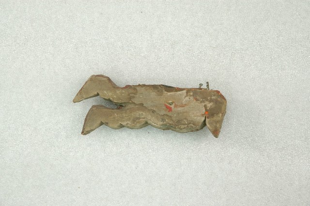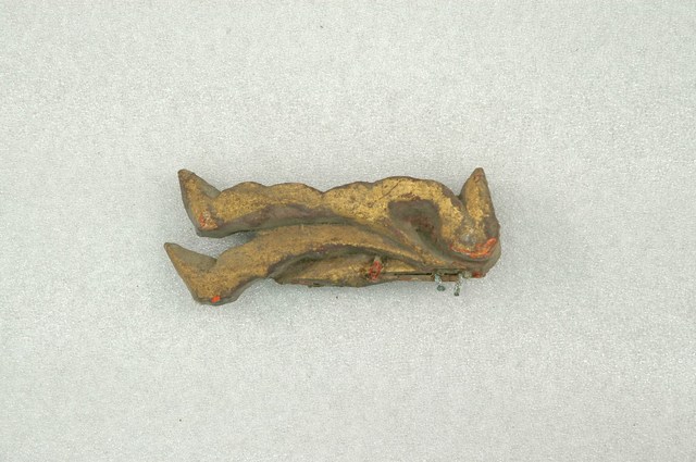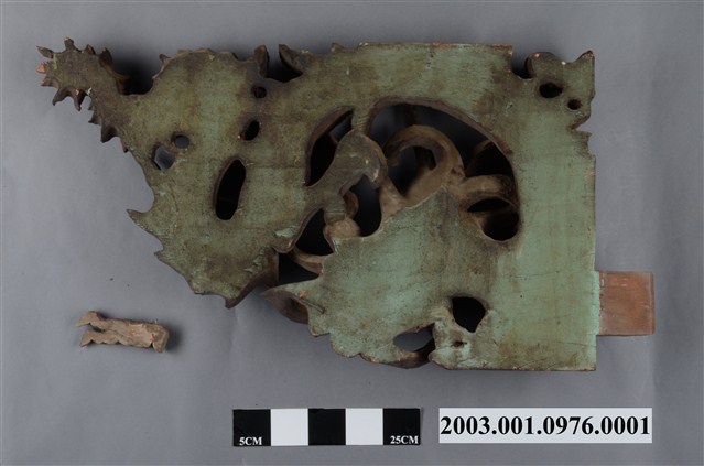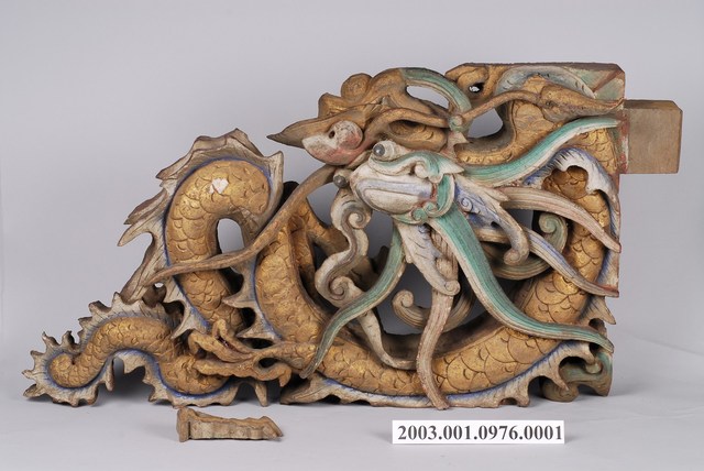 本文物為同一造型插角祖的一件。為傳統漢式建築木構件,名為插角,又稱托木、雀替。插角為三角形,置於樑與柱的交接處,以使樑柱維持直角相交不變形。插角通常都有雕刻,常見圓雕鳥獸或透雕花鳥。本件插角正面作螭龍回首透雕,背面未雕,未上彩處即插入柱中位置。插角正面施金、綠、紅、白、藍彩,背面為綠彩。施彩色調近日本時代中部傳統廟宇風格。