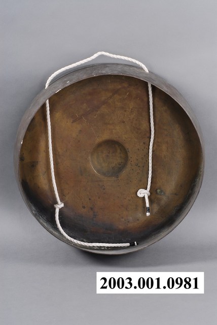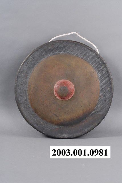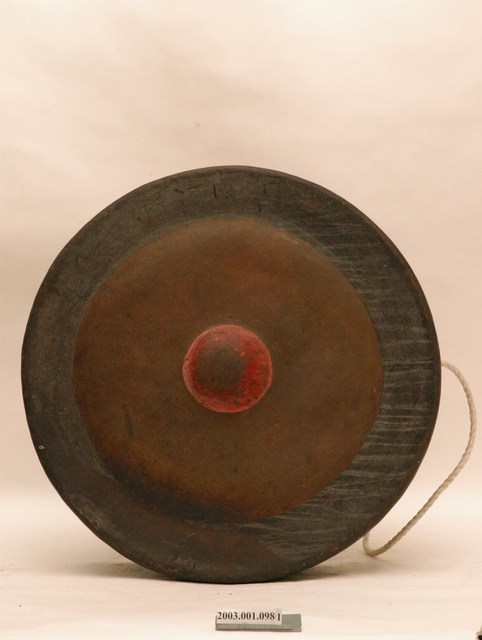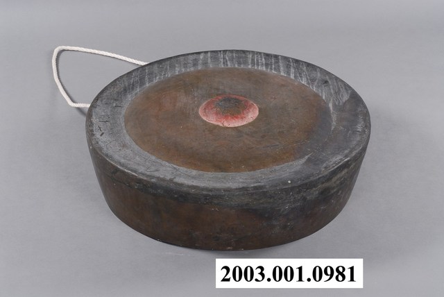 1. 本件為銅製大鑼,鑼面為中間有突出鑼心的形式,鑼心被漆成紅色,本件有明顯銹斑以及磨痕,頂部有穿繩。2. 鑼是銅製圓盤型樂器,依形制約可分為三種:一種是邊緣略向內彎,鑼面略高(此行為數最多,如京劇的大小鑼);一是邊緣呈90度彎曲,鑼面平滑(如:馬鑼、餅鑼);一種是鑼面中心有有突出鑼心(鑼乳),邊緣彎曲程度不一(如:北管大鑼)。3. 鑼的大小尺寸多樣,使用場合也非常廣。大型鑼(直徑達1公尺以上)通常懸掛於鑼架上,以包有橡膠或棉布的鑼錘擊奏,常用於鼓吹樂、戲劇後場、導迎性的儀仗樂隊。小型鑼(直徑為50公分以下)則用於鑼的邊緣鑿洞穿繩,由演奏者懸提,並以木棒擊奏,常用於戲劇或法事後場演奏。羅和鼓為華人民間樂團中經常彆列的兩件重要樂器。民間慶典或戲劇都少不了鑼鼓烘托熱鬧的氣氛,因而有"鑼鼓喧天"的形容詞。本物件樣式為中心有突出鑼心的形制。