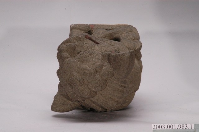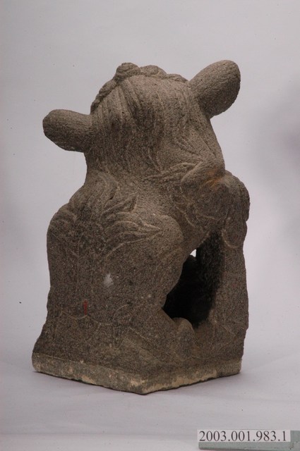 本文物為墓手石獅組的其中一件,為置於虎邊的母獅。本文物一組兩件,雕刻風格相同,為同一對石獅。本組石獅為運用於閩南式墳墓的守護神獸。置於墳墓前方的左右墓手立柱上,為裝飾性柱頭。上段為圓雕獅形,下方基座呈長方體以貼合立柱。成對放置,龍邊為公獅,虎邊為母獅帶小獅,公、母兩獅對望。石獅皆上身立起,傳統閩南式造型表情溫順,扁鼻高額,公獅前腳戲繡球,母獅抱小獅。日本時代開始,受日本獅影響,造型改變,表情重威猛,獅鼻高突,耳加大,公獅以銅錢取代繡球。本件石獅為日本時代以後的造型,母獅抱小獅,鼻高突,耳外揚。其刻紋淺且線條呆板,判斷為戰後1970到1980年代作品。