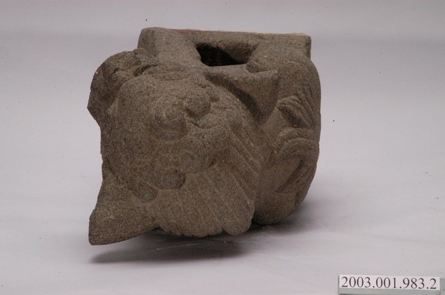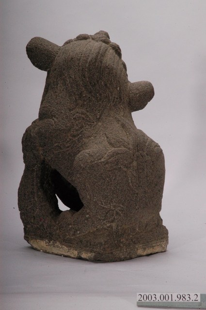 本文物為墓手石獅組的其中一件,為置於龍邊的公獅。本文物一組兩件,雕刻風格相同,為同一對石獅。本組石獅為運用於閩南式墳墓的守護神獸。置於墳墓前方的左右墓手立柱上,為裝飾性柱頭。上段為圓雕獅形,下方基座呈長方體以貼合立柱。成對放置,龍邊為公獅,虎邊為母獅帶小獅,公、母兩獅對望。石獅皆上身立起,傳統閩南式造型表情溫順,扁鼻高額,公獅前腳戲繡球,母獅抱小獅。日本時代開始,受日本獅影響,造型改變,表情重威猛,獅鼻高突,耳加大,公獅以銅錢取代繡球。本件石獅為日本時代以後的造型,公獅腳抓銅錢,鼻高突,耳外揚。其刻紋淺且線條呆板,判斷為戰後1970到1980年代作品。
