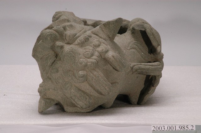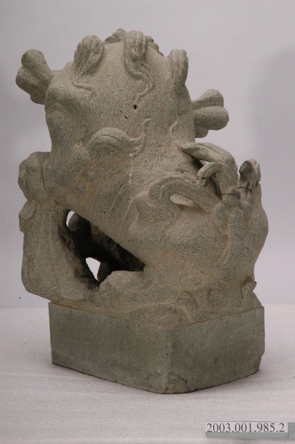 本文物為墓手石獅組的其中一件,為置於龍邊的公獅。本文物一組兩件,雕刻風格相同,為同一對石獅。本組石獅為運用於閩南式墳墓的守護神獸。置於墳墓前方的左右墓手立柱上,為裝飾性柱頭。上段為圓雕獅形,下方基座呈長方體以貼合立柱。成對放置,龍邊為公獅,虎邊為母獅帶小獅,公、母兩獅對望。石獅皆上身立起,傳統閩南式造型表情溫順,扁鼻高額,公獅前腳戲繡球,母獅抱小獅。日本時代開始,受日本獅影響,造型改變,表情重威猛,獅鼻高突,耳加大,公獅以銅錢取代繡球。本件石獅為日本時代以後的造型,公獅腳抓銅錢,鼻高突,耳外揚。由其刻紋為電動工具所刻,判斷為戰後1980年代以後作品。