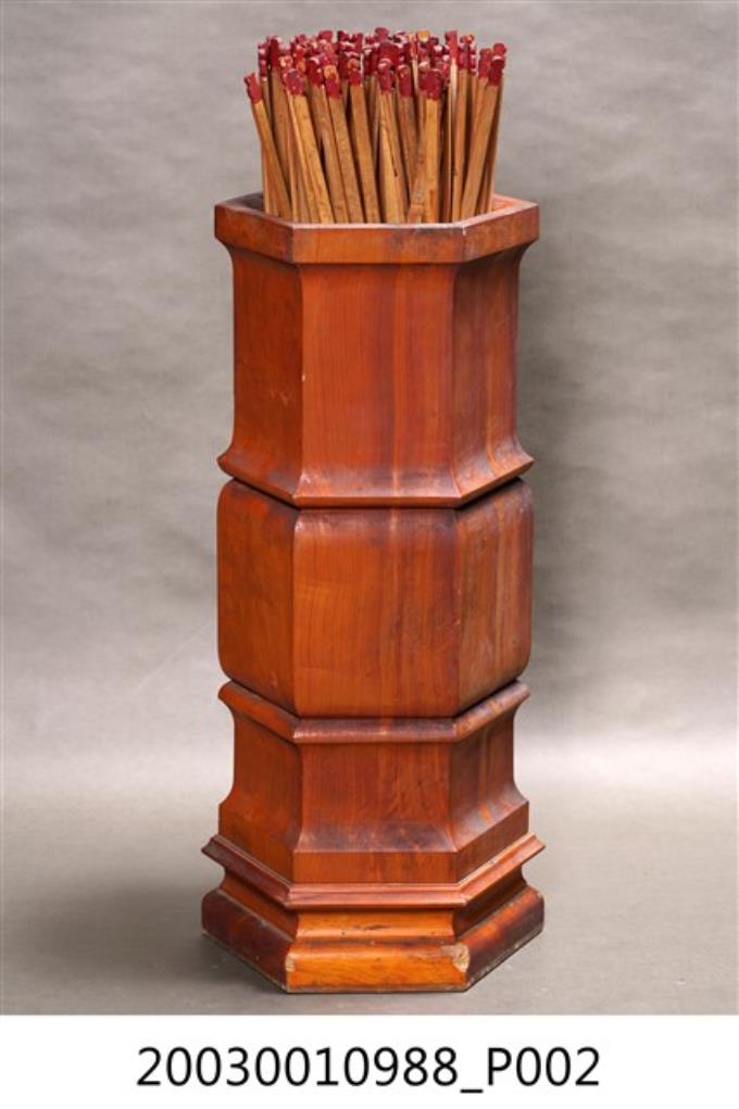 本件為六角木籤筒,桶身並雕出兩節橫紋作為裝飾,內置竹籤。此組竹籤乃以一、三、五等奇數號編碼,至199號,共100支籤。靈籤是各寺廟常見的宗教文物,是一種提供神人溝通的工具,信徒透過對神明的祈求後,通常經擲筊獲神明應允,搖動籤筒抽取浮出的靈籤,並擲筊請示是否是此籤,獲聖筊後,便可對照籤號抽取籤詩。