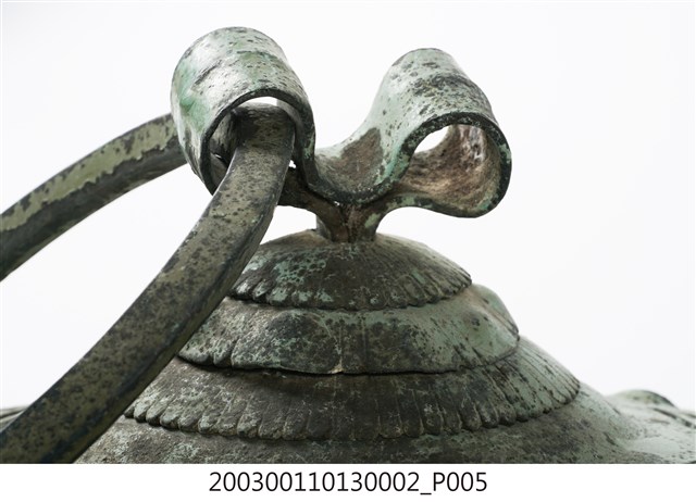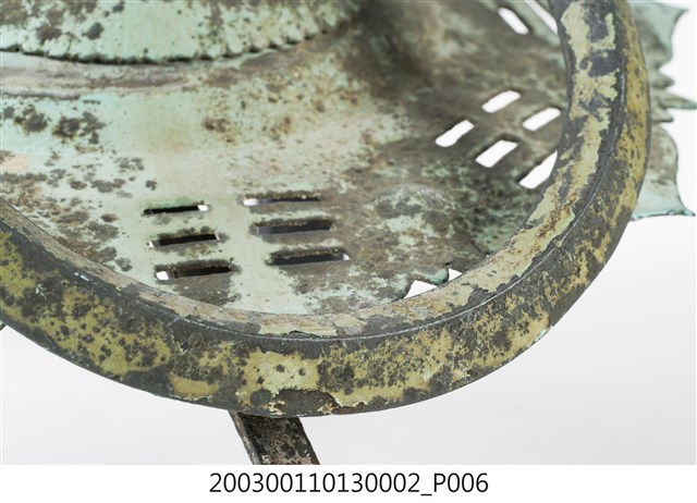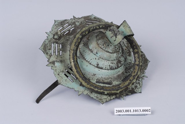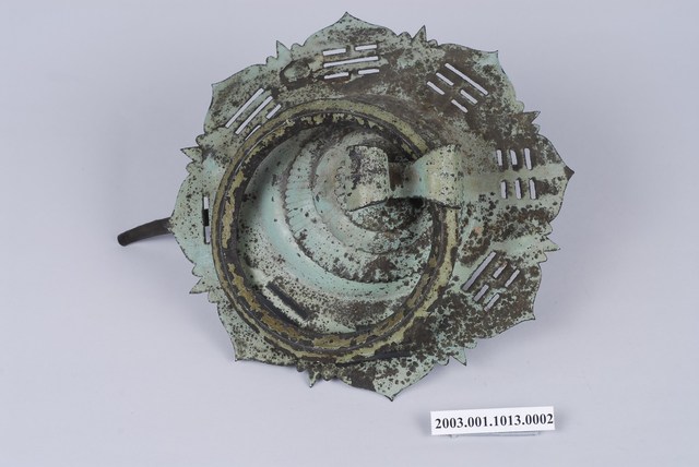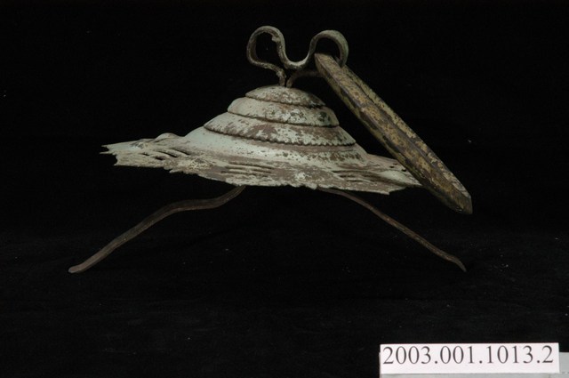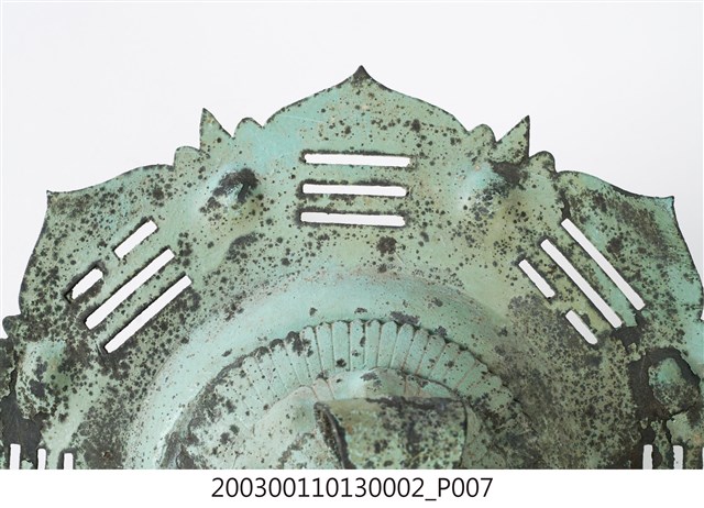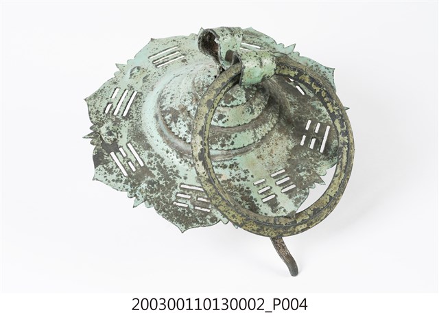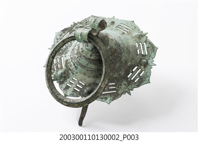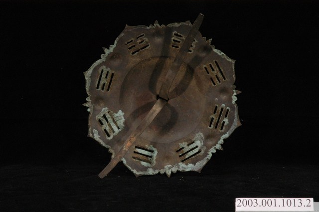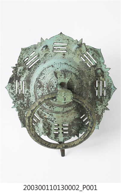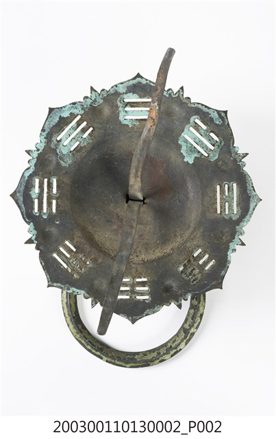 本件文物為館藏號2003.001.1013門環組的一件,一組兩件為一對,另一件為館藏號2003.001.1013.0001。門環又稱鋪首、門鈸,用於木板門上,有鐵或銅兩種材質。本組門環裝設時以掛有環的鈕釘在下。本件門環由凸圓形金屬片、雙結形鈕釘與環圈組成。雙結形鈕釘後方帶兩片針腳,以穿過板門孔洞後固定。環圈穿入鈕釘的下孔,為手拉之處,鈕釘上孔可裝置鎖或長條門閂以固定門片。本件金屬片外圍菱花形,並作鏤空八卦圖案,為臺灣傳統建築門環常見形式。本組門環為鐵製,局部有鏽蝕,表面於使用時上漆,部分剝落。