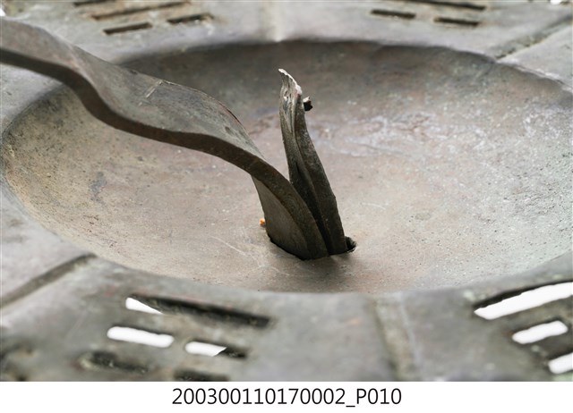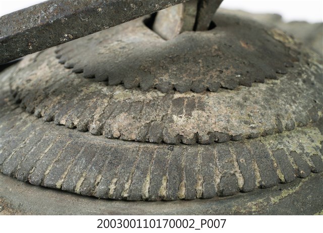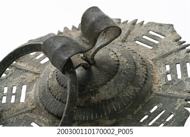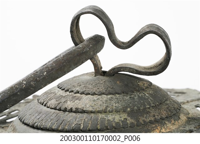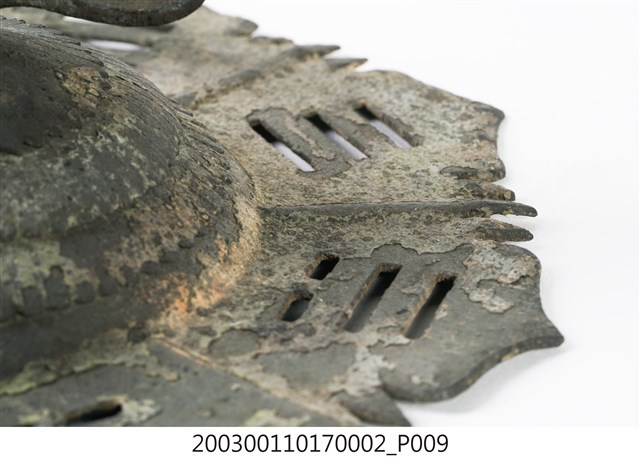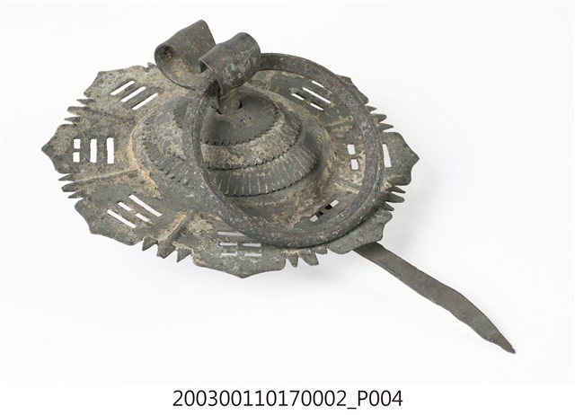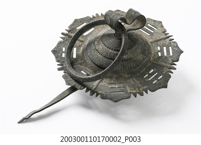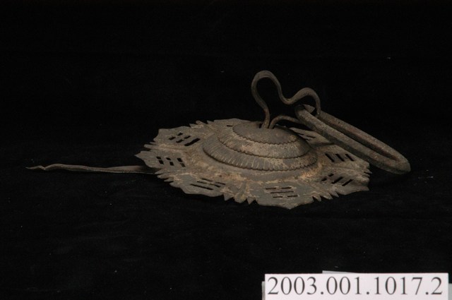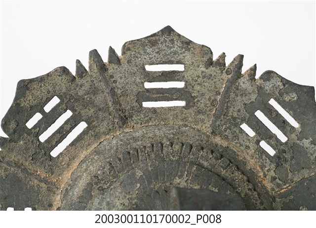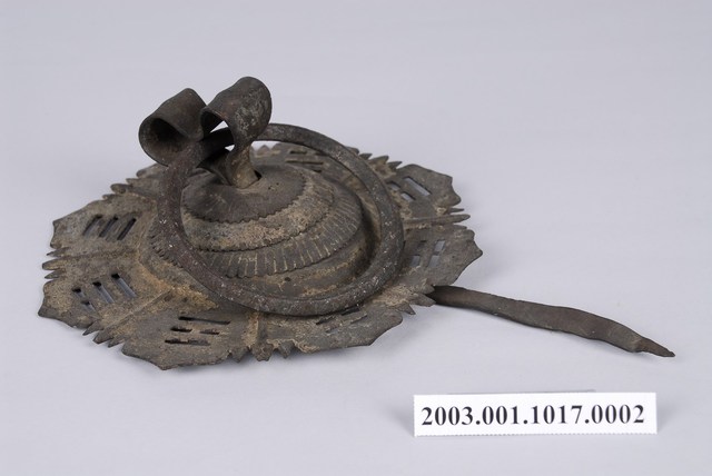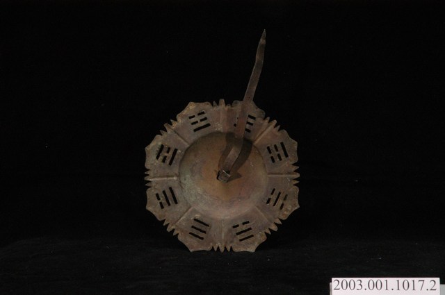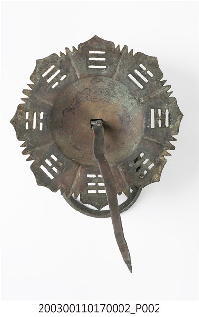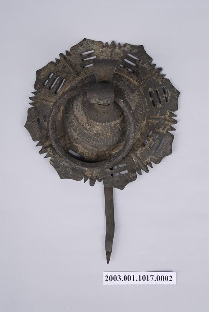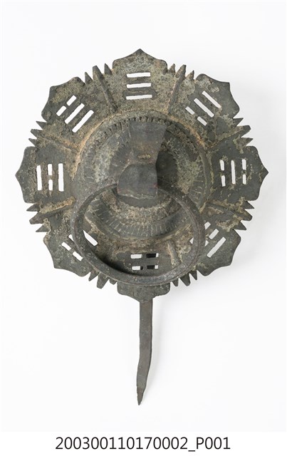 本件文物為館藏號2003.001.1017門環組的一件,一組兩件,但此兩件並非同一對,另一件為館藏號2003.001.1017.0001。門環又稱鋪首、門鈸,用於木板門上,有鐵或銅兩種材質。本組門環裝設時以掛有環的鈕釘在下。本件門環由凸圓形金屬片、雙結形鈕釘與環圈組成。雙結形鈕釘後方帶兩片針腳,以穿過板門孔洞後固定。環圈穿入鈕釘的下孔,為手拉之處,鈕釘上孔可裝置鎖或長條門閂以固定門片。本件金屬片外圍菱花形,並作鏤空八卦圖案,為臺灣傳統建築門環常見形式。本組兩件雖基本圖案相同,但繁簡作法有異,非出自同一模具打造。本件門環為鐵製,局部有鏽蝕。由本件未上漆,另一件局部上漆,顯示使用歷程不同,推測本組兩件非使用於同一對門板上。