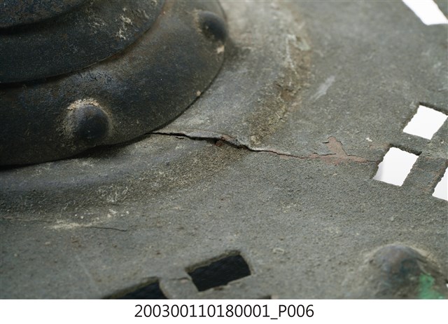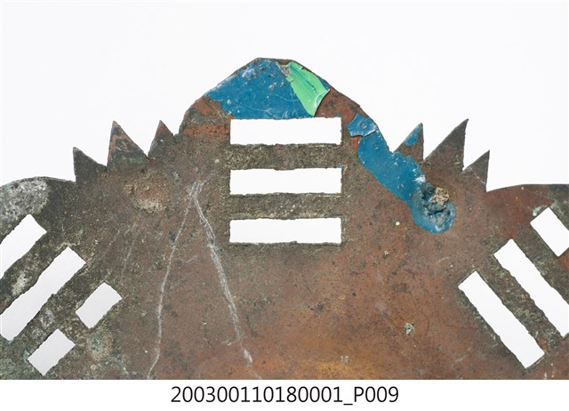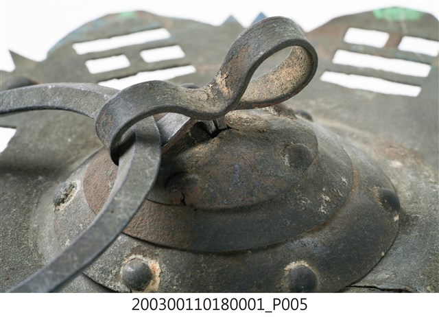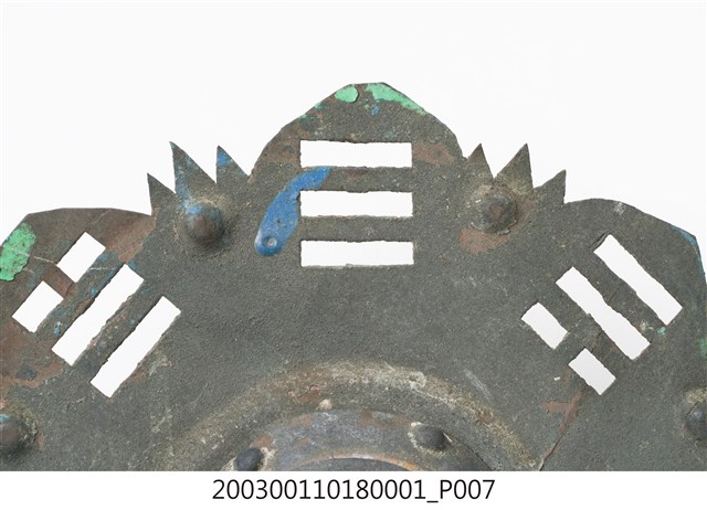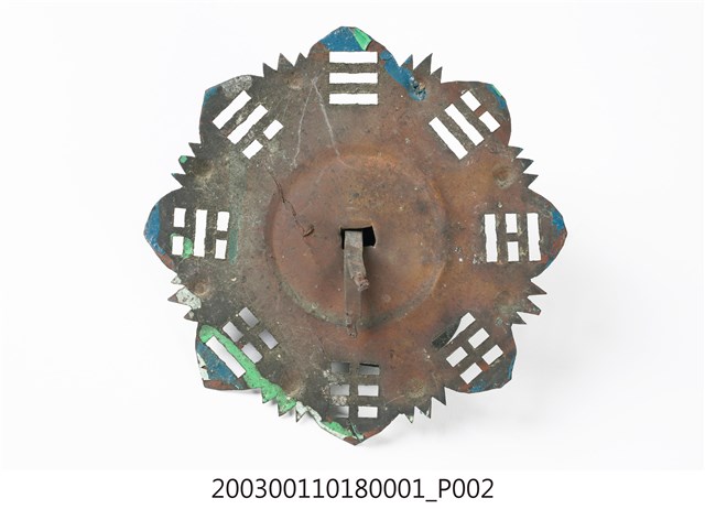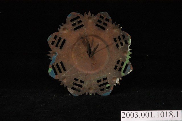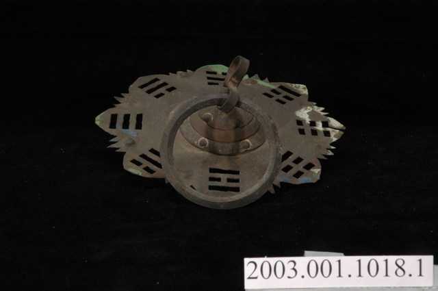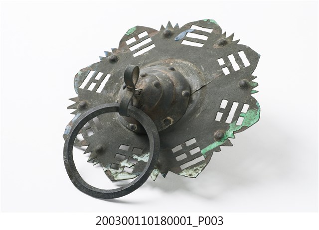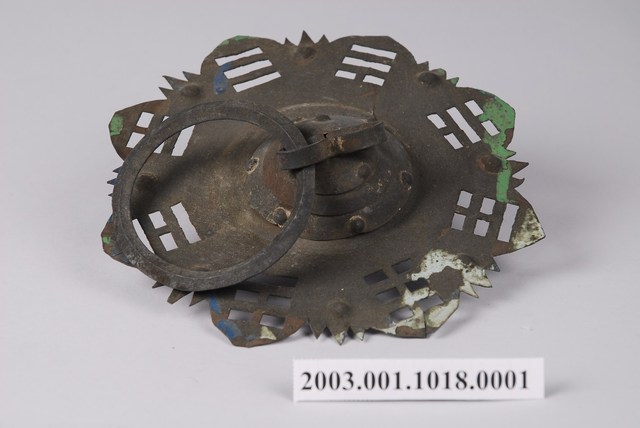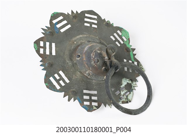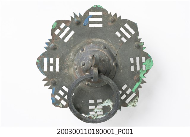 本件文物為館藏號2003.001.1018門環組的一件,一組兩件,但此兩件並非同一對,另一件為館藏號2003.001.1018.0002。門環又稱鋪首、門鈸,用於木板門上,有鐵或銅兩種材質。本組門環裝設時以掛有環的鈕釘在下。本件門環由凸圓形金屬片、雙結形鈕釘與環圈組成。雙結形鈕釘後方帶兩片針腳,以穿過板門孔洞後固定。環圈穿入鈕釘的下孔,為手拉之處,鈕釘上孔可裝置鎖或長條門閂以固定門片。本件金屬片外圍菱花形,並作鏤空八卦圖案,為臺灣傳統建築門環常見形式。本組兩件雖基本圖案相同,但細部圖案相異,非出自同一模具打造。本組門環為鐵製,局部有鏽蝕,局部有上漆痕跡。由兩件上漆顏色相異,顯示使用歷程不同,推測本組兩件非使用於同一對門板上。
