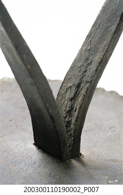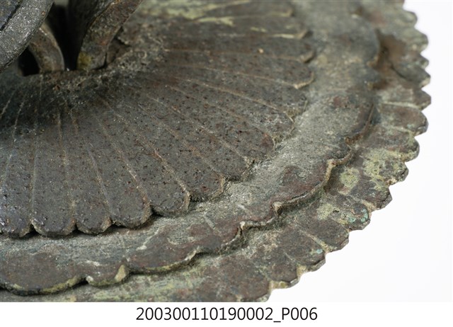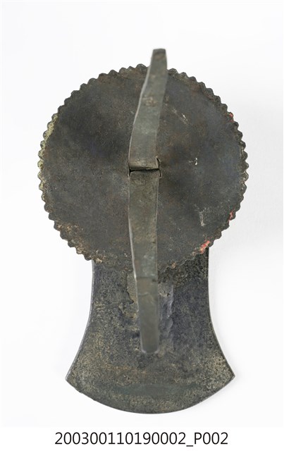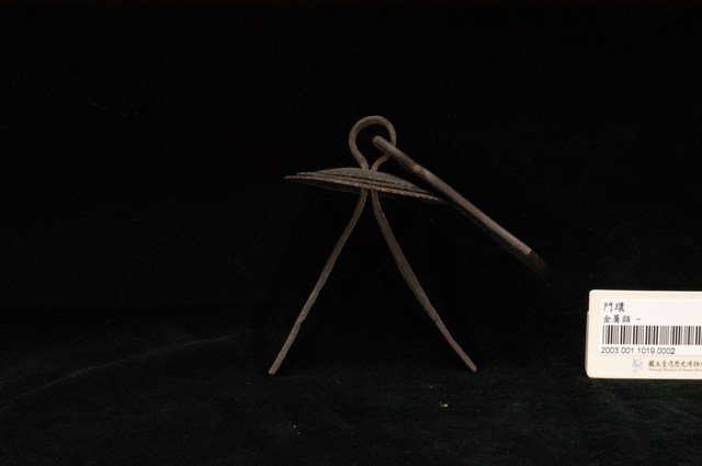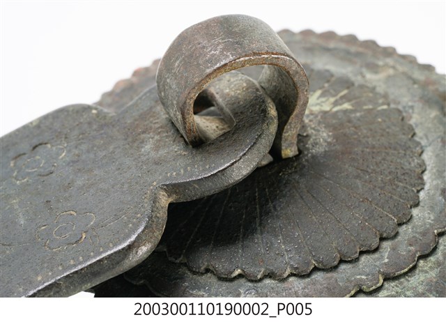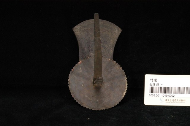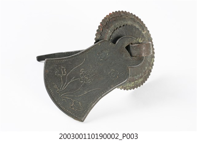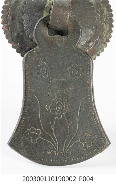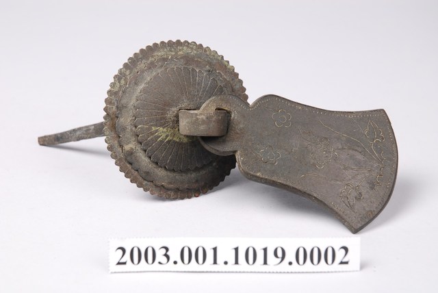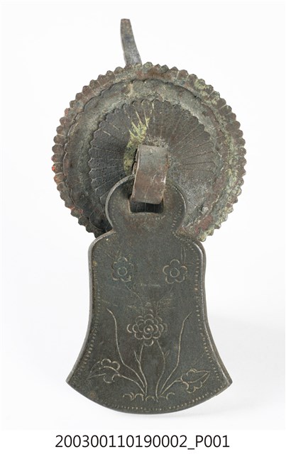 本件文物為櫥櫃的把手,為館藏號2003.001.1019櫥櫃把手組的一件,另一件館藏號為2003.001.1019.0001。兩件的墜相同,但圓形鐵片作法細節不同,非同一對。把手用於木櫃門上。中國大陸稱櫥櫃把手為拉手。本件把手由三層圓形鐵片、針腳與鐘形墜組成。針腳穿過櫃門孔洞後固定,鍾形墜則為手拉之處。墜上有陰刻牡丹與梅圖案,雖為傳統吉祥題材,但配置與表現方式與傳統不同,推測為戰後出現的仿古把手。