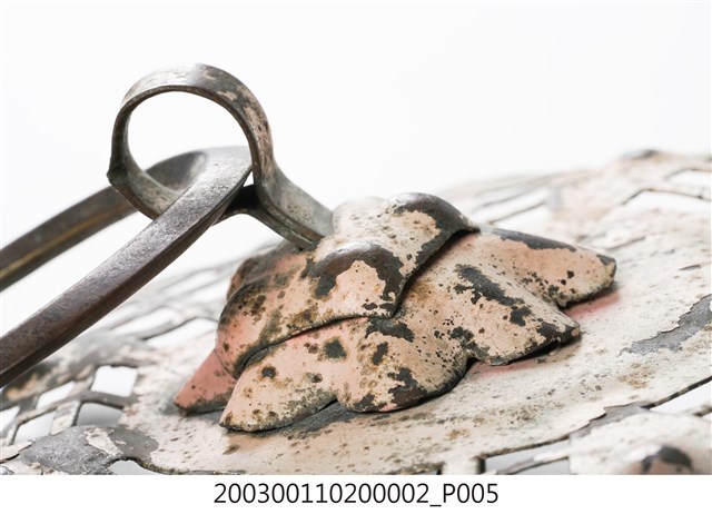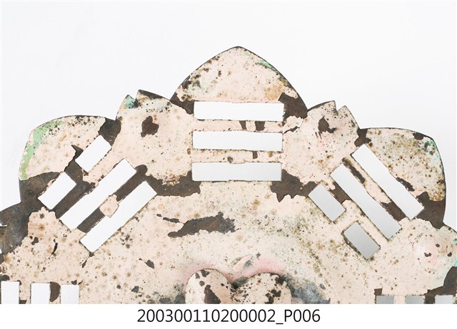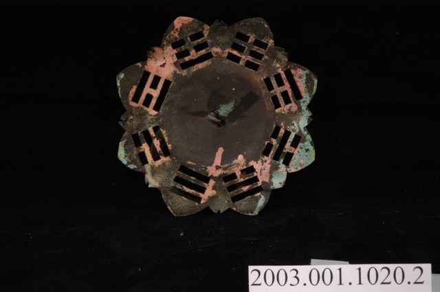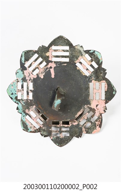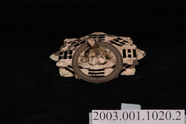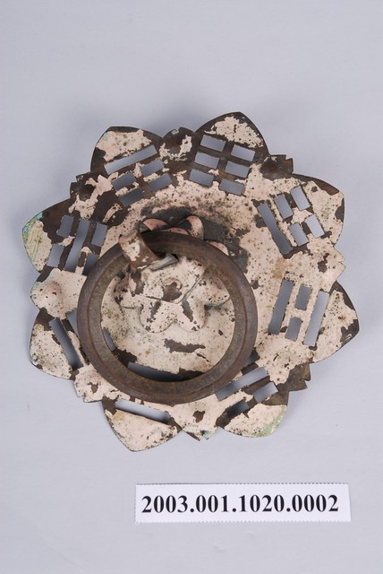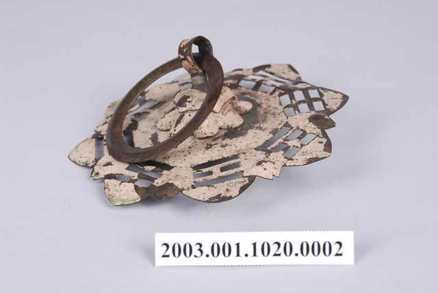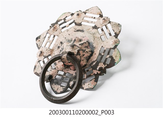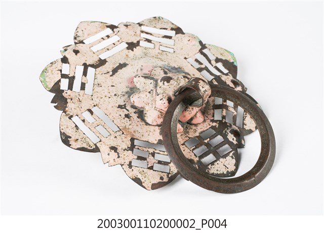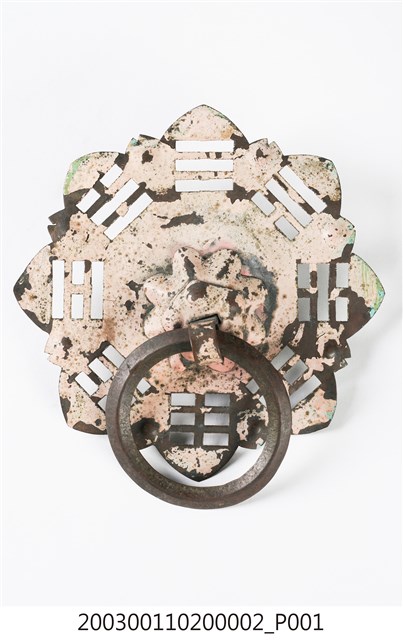 本件文物為館藏號2003.001.1020門環組的一件,一組兩件為一對,另一件為館藏號2003.001.1020.0001。門環又稱鋪首、門鈸,用於木板門上,有鐵或銅兩種材質。本組門環裝設時以掛有環的鈕釘在下。本件門環由凸圓形金屬片、雙結形鈕釘與環圈組成。雙結形鈕釘後方帶兩片針腳,以穿過板門孔洞後固定。環圈穿入鈕釘的下孔,為手拉之處,鈕釘上孔可裝置鎖或長條門閂以固定門片。本件金屬片外圍菱花形,並作鏤空八卦圖案,為臺灣傳統建築門環常見形式。本組門環為鐵製,局部有鏽蝕,表面上漆。