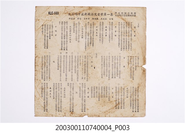 2003.001.1074.0004 太王唱片公司發行編號「KLC-103」兒歌專輯《最新國語兒童歌第一集》歌詞單
