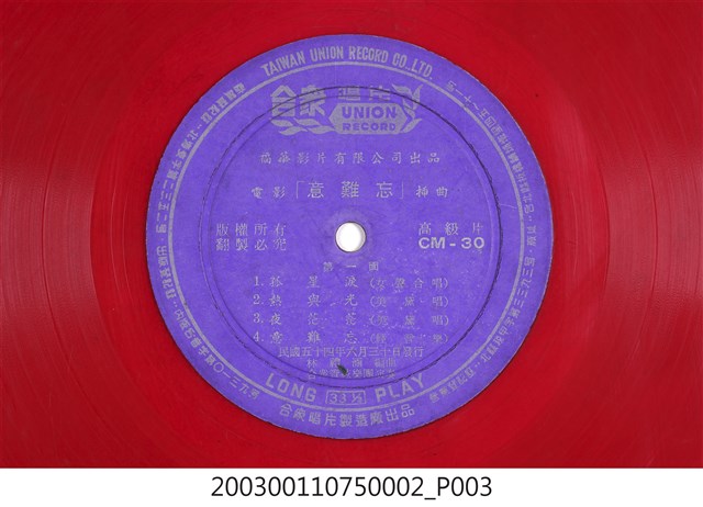 合眾唱片公司發行編號「CM-30」華語歌曲專輯《意難忘》10吋塑膠唱片