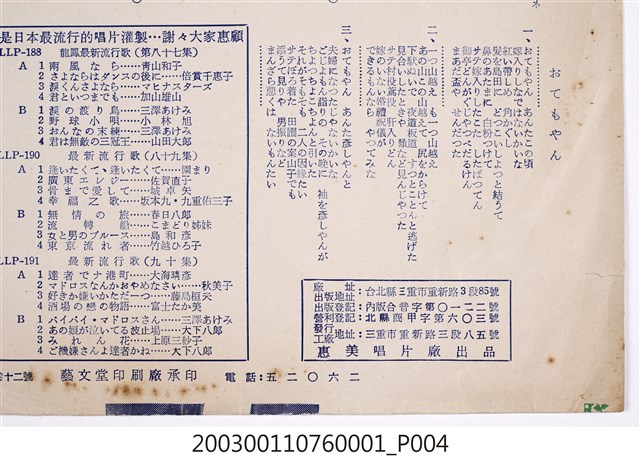 惠美唱片公司發行龍虎商標編號「LLP-111」日語歌唱專輯《小林旭來台紀念歌》